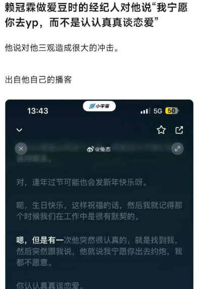 赖冠霖播客提及前经纪人,曾对他说“我宁愿你出去,都不愿意你认认真真谈恋爱。” 经纪人认为和女生稳定谈恋爱,会影响男演员接戏和演戏。 对他的影视作品印象还停留在《初恋那件小事》,一直到退圈的通告,其实到最后也不知道因为什么原因退圈,只能尊重艺人的选择