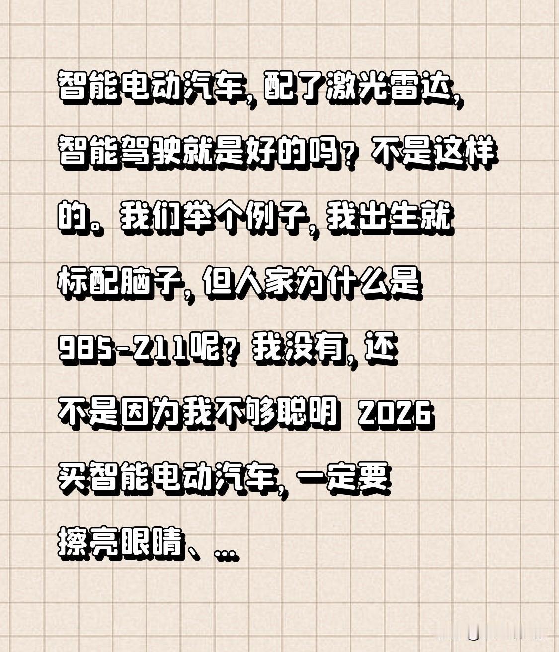 智能电动汽车,配了激光雷达,智能驾驶就是好的吗?不是这样的。我们举个例子,我出生就标配脑子,但人家为什么是985-211呢?我没有,还不是因为我不够聪明~ 2026买智能电动汽车,一定要擦亮眼睛、小心谨慎。别买了几万的车,连主动安全都没有的智能电动汽车。 买智能电动汽车,余总旗下的五个界,华为系的HI模式的车。 如果是买电动车那随便买,便宜性价比高,又有技术的厂商,买这些车就可以了。