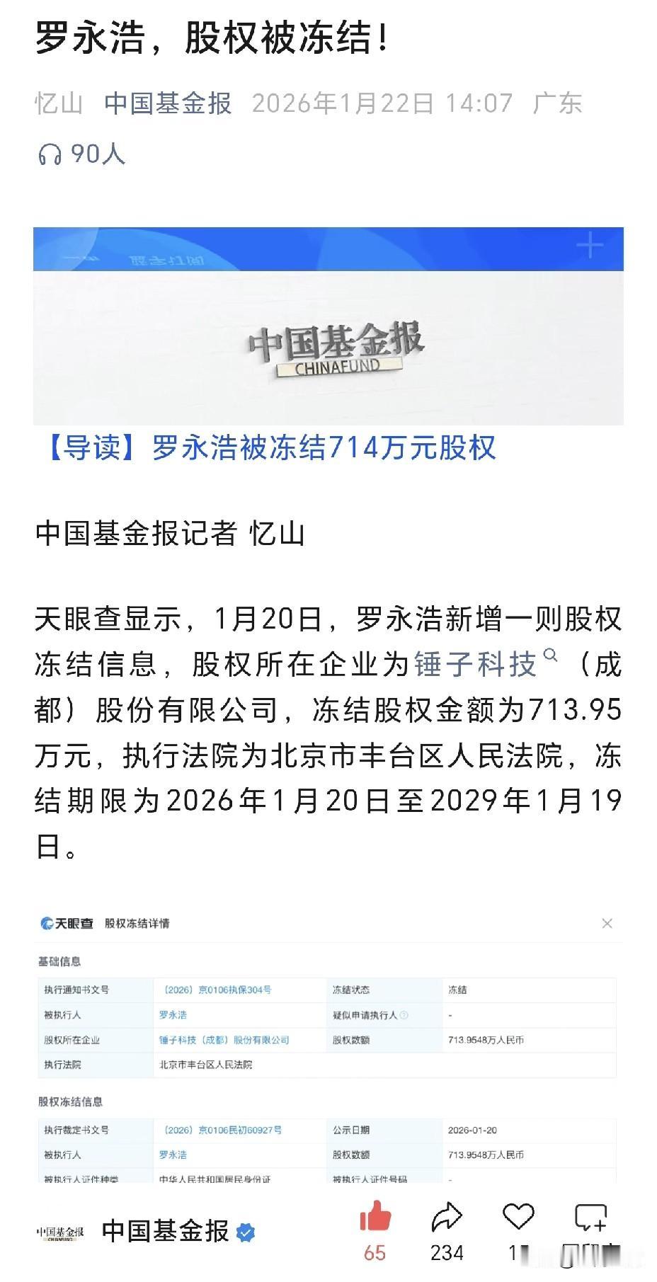 罗永浩又摊上事了!1月20日他在成都锤子科技的714万股权被冻结,算上这次,他被