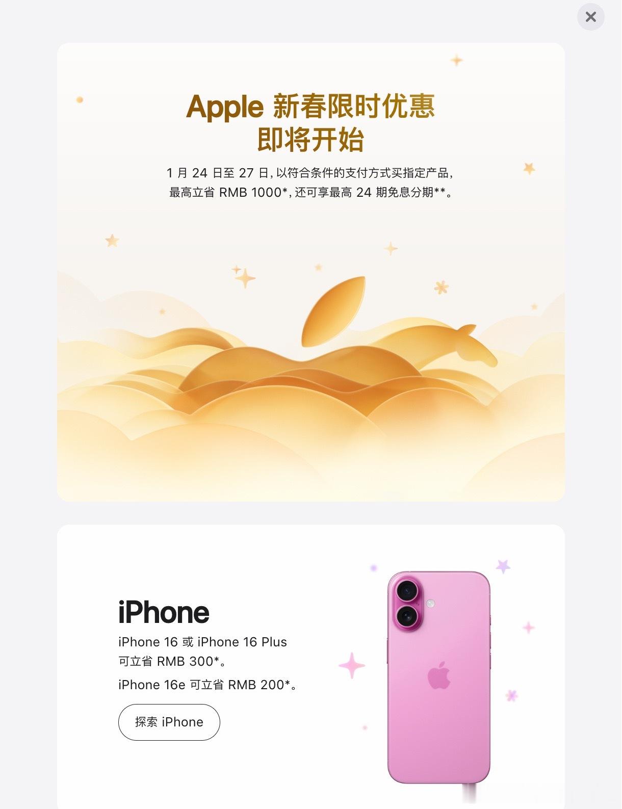苹果官网最高降价1000元一年一度苹果新春限时优惠活动来了,目前已经上线苹果中国官网了看了一下,限时优惠4天,用户于2026年1月24日0时1分至1月27日23时59分以符合条件的支付方式买指定产品最高立省1000元。在iPhone产品方面,购买iPhone 16或iPhone 16 Plus立省 300 元;购买iPhone 16e立省200元,但新发布的iPhone17系列并未出现在活动页面中。对于iPhone 17系列没出现在活动中,太正常了,看看17系列销量就知道了,因为卖的好啊,供不应求啊卖不过来的产品肯定不会优惠!苹果回应iPhone17不参加新春优惠