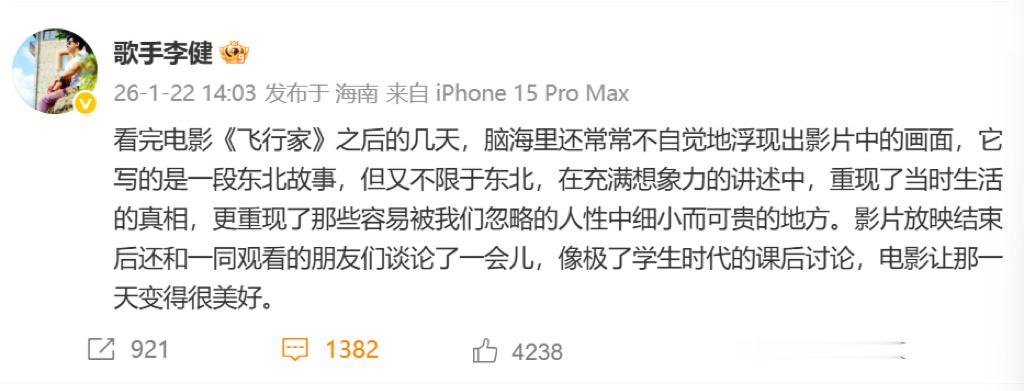 李健看了蒋奇明新片飞行家让李健想起了学生时代 李健也被蒋奇明的《飞行家》戳中了!在看完之后风几天脑海里反复浮现画面,观影后和朋友谈论的样子,瞬间梦回学生时代的课后讨论~这部东北故事里藏着的人性美好与生活真相,让李健狠狠共情。