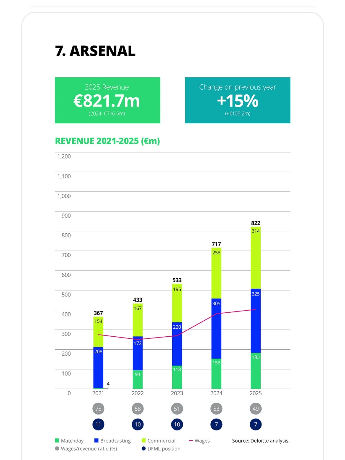 德勤发布2026足球财富榜:主场优势驱动着豪门生存。阿森纳首次在该榜单上超越曼联来到世界第7位。全文如下:这份年度报告剖析了全球收入最高的足球俱乐部。2024/25赛季再次创下新纪录,财富榜前20名俱乐部的总收入历史上首次突破120亿欧元。继2023/24赛季成为首家收入突破10亿欧元的足球俱乐部后,皇家马德里在2024/25赛季再次超越这一纪录,收入接近12亿欧元,成为全球收入最高的足球俱乐部。该俱乐部通过增加商品销售和赞助获得了5.94亿欧元的商业收入。足球俱乐部收入的演变令人惊叹——仅此一项商业收入,就足以让皇马跻身今年财富榜前十。财富榜俱乐部的累计收入增长了11%,达到124亿欧元。比赛日收入(24亿欧元)、转播收入(47亿欧元)和商业收入(53亿欧元)均创下历史新高,其中商业收入首次突破50亿欧元。商业收入连续第三年占据财富榜俱乐部总收入的最大份额,平均达2.65亿欧元。其增长的关键驱动力包括零售业绩改善、赞助收入增加,以及在非比赛日对体育场馆及周边设施的利用。后者标志着部分俱乐部商业模式的重大转变,即通过多样化的娱乐产品提高体育场馆资产的利用率。因此,现场酿酒厂、餐厅、酒店和其他设施变得越来越普遍,这表明俱乐部拓宽创收渠道的重要性,凸显了足球俱乐部的品牌和场馆持续演变,其价值已远超球场内发生的一切。财富榜俱乐部的比赛日收入达到24亿欧元的创纪录水平,并且连续第四年成为财富榜俱乐部中增长率最高的收入来源(16%)。俱乐部为提升比赛日体验所做的努力,加上个人座位许可证等创收手段的应用,是推动这一增长的关键。2024/25赛季,转播收入增长了10%,仍然是财富榜俱乐部收入的基础组成部分,占124亿欧元总收入的38%。转播收入的重要性在第11至20名的俱乐部中更为明显,占其总收入的近一半(49%),而前十名俱乐部则占三分之一,这进一步印证了高收入俱乐部近年来在经营策略上的转变。2024/25赛季财富榜俱乐部转播收入增长的主要驱动力是扩军后的国际足联俱乐部世界杯的影响。十家财富榜俱乐部参加了去年夏天的世俱杯赛事,其转播收入因此提升了17%。此外,欧足联旗下三项主要男子俱乐部赛事的扩军也促进了俱乐部收入增长,欧足联为这些赛事分配的资金在2024/25赛季增至33亿欧元,较2023/24赛季的27亿欧元增长约22%。赛程内比赛场次的增加给球员福利带来了一些挑战,在2024/25赛季,财富榜俱乐部平均进行了57场正式比赛。需要在赛事创新、球员福利和球迷兴趣之间取得平衡。在国内市场,意甲和法甲在2024/25赛季开始新的国内转播权协议时都面临阻力。意甲关于联赛和杯赛直播与非直播的新国内协议,使得每赛季的平均转播权总价值下降了约3%,阻碍了俱乐部的收入增长。与此同时,经过漫长的招标过程,法甲2024/25赛季新国内协议的价值较上一周期低了约20%。随后,包含每周末8场直播比赛的DAZN协议经双方同意终止,促使法甲在2025/26赛季初推出了直接面向消费者的流媒体服务。这将在中短期内对法国俱乐部的转播收入产生负面影响,但也使法甲成为首个采用D2C模式的欧洲主要足球联赛,我们将密切关注从长远看,这是否代表一种其他联赛可能效仿的重大转变。随着欧洲国内转播权市场趋于平稳,观察到的最显著趋势是商业收入对俱乐部摆脱对赛场成绩依赖、实现收入增长的重要性日益增加。俱乐部和其他关键利益相关者需要超越单纯增加"库存"的策略来提升价值,这更要求俱乐部主动建立和发展独特的创收商业模式。许多俱乐部越来越认识到其品牌和场馆的影响力,以及它们在全球最受欢迎运动的生态系统中所扮演的角色。我们观察到,俱乐部,尤其是商业收入占总收入48% 的前十名俱乐部,正持续加强对自身创收能力的掌控。这包括利用其品牌资产推动增长,无论是通过零售产品、独家直接面向消费者的内容,还是更传统的合作伙伴关系。过去十年间,财富榜前十俱乐部的平均收入增长了60%,而第11至20名俱乐部的增长接近84%。与财富榜前十俱乐部的典型商业模式不同,第11至20名的俱乐部近年来主要依靠转播收入作为增长杠杆。随着多个国内转播市场趋于平稳,从长远来看,我们可能会看到越来越多的俱乐部采取更主动的商业化策略来推动进一步增长。俱乐部层面分析2024/25赛季,皇家马德里连续第二年成为唯一一家收入超过10亿欧元的足球俱乐部。尽管该俱乐部的比赛日收入报告下降了6%,但其2.33亿欧元的比赛日收入仍将是财富榜俱乐部有史以来的第二高。此外,得益于商品销售业绩提升和新商业合作伙伴的加入,其商业收入增长了23%。巴塞罗那足球俱乐部自2019/20赛季以来首次重返财富榜前三,收入达9.75亿欧元。尽管继续在临时主场进行比赛,其收入较2023/24赛季增长了27%。增长的一个关键驱动力是引入了个人座位许可证安排,一次性带来了约7000万欧元收入。拜仁慕尼黑以8.61亿欧元收入位居第三,较去年上升两位,这得益于参加2025年世俱杯带来的转播收入增加。巴黎圣日耳曼凭借赢得队史首座欧冠的成功赛季,连续第四年位居前五。此外,该俱乐部继续成功利用其品牌资产推动商业增长。利物浦在财富榜历史上首次成为收入最高的英格兰俱乐部,总收入8.36亿欧元。这得益于重返欧冠带来的转播收入增长34%,以及安菲尔德球场增加非比赛日活动推动商业收入增长7%。曼城收入为8.29亿欧