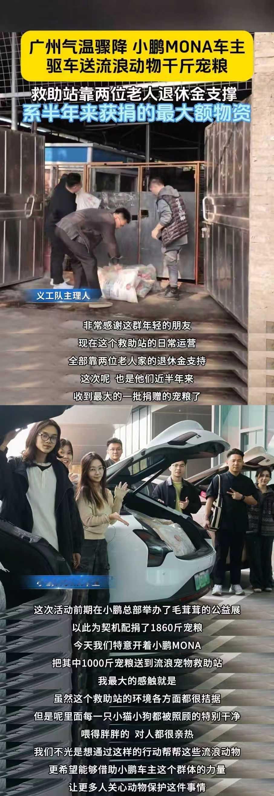 近日,小鹏MONA车主驱车携千斤宠粮送往一家流浪动物救助站,为这个靠两位老人退休金苦苦支撑的小院,送来近半年最大额的一笔捐赠物资。本次捐助以在小鹏总部举办的公益展为契机,一共配捐1860斤宠粮用于流浪动物的安置。该救助站共育有200+猫狗,恰逢广州迎较强冷空气,流浪动物救助安置需求激增,这份暖心捐赠正解了救助站的燃眉之急。善意从不是大张旗鼓,是实实在在的奔赴。小鹏MONA车主送救助站千斤宠粮