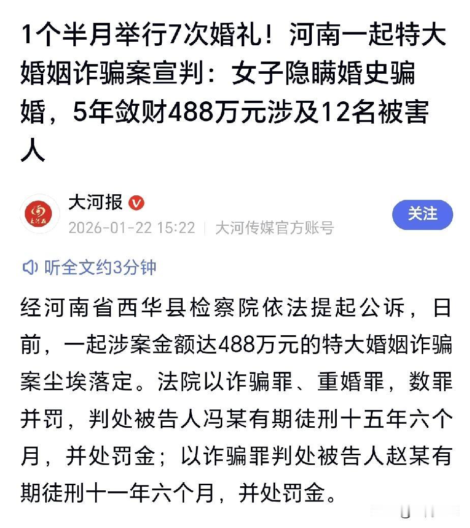 河南女子1个半月办7场婚礼,5年骗488万!这操作刷新三观! 河南这起婚骗案也太离谱了!女子冯某带着亲姐姐赵某组团演戏,隐瞒已婚事实骗婚,5年坑了12个男人,卷走488万,光2024年底到2025年初,就赶着场似的办了7场婚礼,这效率比专业婚庆公司还高。 说白了,这就是场精心设计的骗局:冯某扮单身美女钓人,姐姐当“大姨姐”打掩护,一口一个“我妹绝对单身”,骗来的彩礼全由姐姐保管,姐妹俩配合得天衣无缝。受害者大多是想踏实过日子的人,被“结婚”的幌子冲昏头脑,心甘情愿掏彩礼,有的甚至没要结婚证就办了婚礼,最后人财两空。 其实这骗局漏洞百出,可为啥能得逞?还不是抓住了部分人婚恋焦虑、觉得“付了彩礼就能娶到媳妇”的畸形心态。现在两人被判十几年牢,也算罪有应得,但被骗的钱能不能追回来还不好说。这事儿也提醒大家,结婚可不是小事,先核实身份、领了结婚证再谈彩礼,别被爱情冲昏头,让骗子钻了空子! 婚姻骗婚 假婚骗局 婚恋骗婚 骗婚骗局 婚介骗彩礼