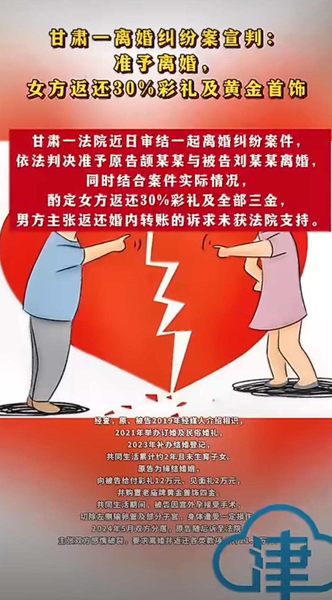 甘肃有这么一起离婚纠纷案件,最近引发了不少关注,事情的来龙去脉说起来还挺让人唏嘘的。这对夫妻是经媒人介绍认识的,后来按当地习俗办了订婚和民俗婚礼,过了一阵子才补了结婚登记,前后共同生活了差不多两年,就是没生小孩。当初为了结婚,男方给了女方12万彩礼和2万见面礼,还特意买了老庙牌的黄金首饰,也就是大家常说的“四金”。本来也是一段正常的婚姻,没想到后来出了变故,女方在共同生活期间因为宫外孕做了手术,不仅切了左侧输卵管,还切除了部分子宫,身体受到了挺严重的永久性损伤。可让人没想到的是,两人后来因为家庭琐事闹了矛盾,分开居住后,男方直接把女方告上了法院,要求离婚不说,还得返还全部彩礼、见面礼、黄金首饰,再加上婚内的一些转账,算下来一共要21.5万元。 面对男方的起诉,女方这边也有自己的说法,她觉得两人感情还没到彻底破裂的地步,而且自己刚因为手术伤了身体,实在不同意离婚。同时她还提到,男方这次起诉距离之前法院判决不准离婚还没满一年,不符合相关规定。不过法院审理后发现,这对夫妻长期分居,矛盾积累了不少,而且女方之前也曾经提起过离婚诉讼,种种情况都说明夫妻感情已经实际破裂了,所以最终还是判决准予两人离婚。 接下来就是大家最关心的财产返还问题了,法院在这方面可是做了不少考量。根据相关的法律规定,处理彩礼返还纠纷时,得结合共同生活时长、双方实际情况还有当地习俗来综合判断。法院认为,男方要求返还全部彩礼确实没什么合理依据,毕竟两人已经共同生活了两年,而且女方因为宫外孕手术身体受了重伤,后续生活也可能受到影响。所以最终法院酌定女方返还彩礼和见面礼总共14万元的30%,也就是4.2万元。至于那些黄金首饰,因为是男方以结婚为目的赠送的,现在婚姻关系解除,法院判决女方全部退还。而男方要求返还的婚内转账,法院认定那些都是婚姻存续期间夫妻之间正常的经济往来,不属于需要返还的范畴,所以驳回了这部分诉求。 其实从法律角度来说,彩礼返还不是简单的“结婚了就不退”或者“离婚了就全退”,像这种“四金”之类的贵重物品,因为是专门为结婚准备的,通常会被认定为彩礼的一部分。而日常的小额转账、节日礼物这些,一般会被算作增进感情的消费支出,不会被纳入彩礼返还的范围。法院这次的判决,既考虑了法律规定,也兼顾了双方的实际情况,尤其是女方身体受损的特殊情况,算是比较合理的处理方式。