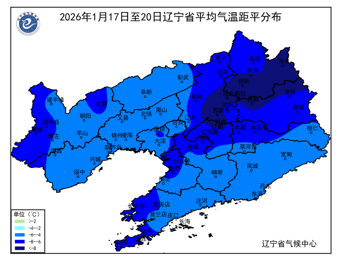 图12026年1月17日至20日辽宁省平均气温距平分布(℃)