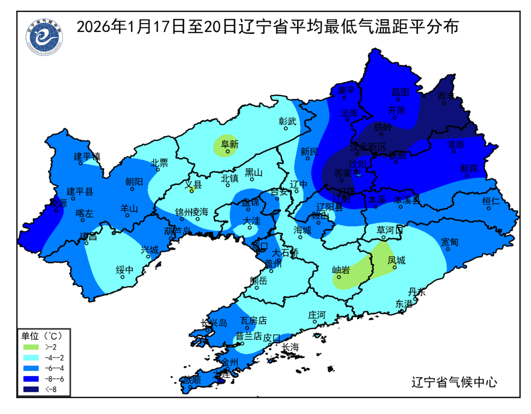 图32026年1月17日至20日辽宁省平均最低气温距平分布(℃)