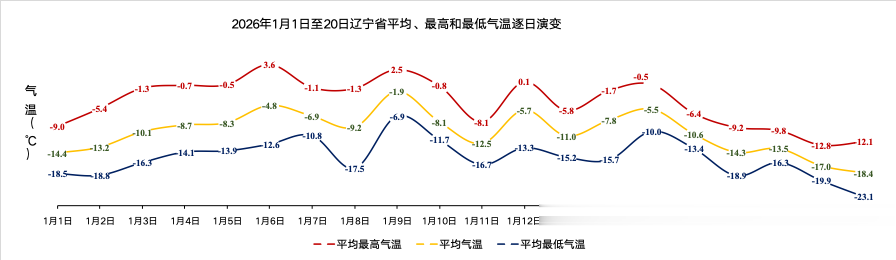 图52026年1月1日至20日辽宁省平均、最高和最低气温演变(℃)