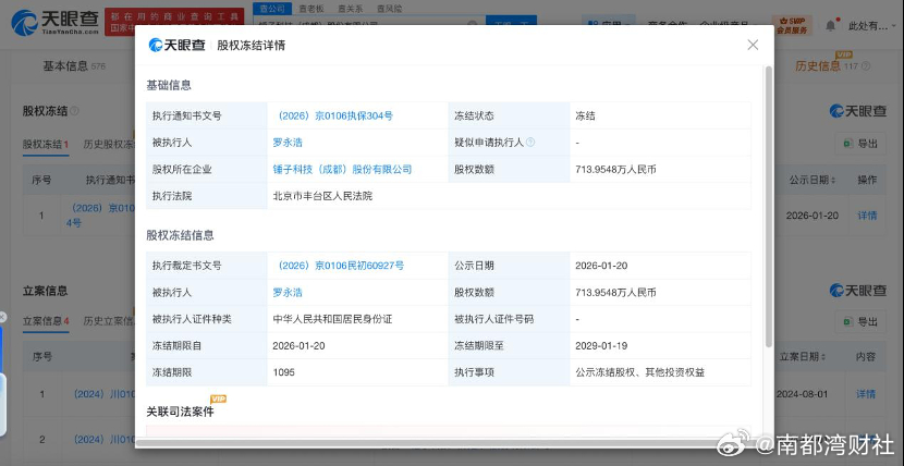 【#罗永浩名下700余万元股权被冻结#,微博账号仍被禁言】天眼查天眼风险信息显示,近日,罗永浩新增一则股权冻结信息,股权所在企业为锤子科技(成都)股份有限公司,冻结股权数额713万余元,冻结期限自2026年1月20日至2029年1月19日,执行法院为北京市丰台区人民法院。工商信息显示,锤子科技(成都)股份有限公司成立于2012年5月,法定代表人为管志良,注册资本约3149.8万人民币,经营范围含基础软件服务、应用软件服务、组织文化艺术交流活动、维修通讯设备、生产手机等。股东信息显示,该公司由罗永浩、成都东方广益投资有限公司、北京明匠汇智投资管理合伙企业(有限合伙)等共同持股。罗永浩在该公司22.67%。根据天眼查信息,锤子科技(成都)股份有限公司目前有多条被执行信息,历史限制消费令涉案总金额达到2142.86万元。去年紫辉创投CEO郑刚起诉锤子科技(成都)股份有限公司1500万元借款纠纷案,经一审、二审审理,最终二审维持原判,锤子科技需偿还1500万元本金及年利率6%的利息,并承担诉讼费,判决已生效。去年9月,因未按期履行还款义务,锤子科技被法院列为失信被执行人。此前, 罗永浩因为和西贝的骂战,微博账号被禁言。罗永浩曾在朋友圈回应称,“平台对我禁言15天,我善意解读成是对我的保护”,还表示个人不会再回应这件事。1月18日,罗永浩还出现在B站百大UP主盛典,并领取年度新人奖,但在领奖时奖杯断成两半。南都N视频APP · 政商数据