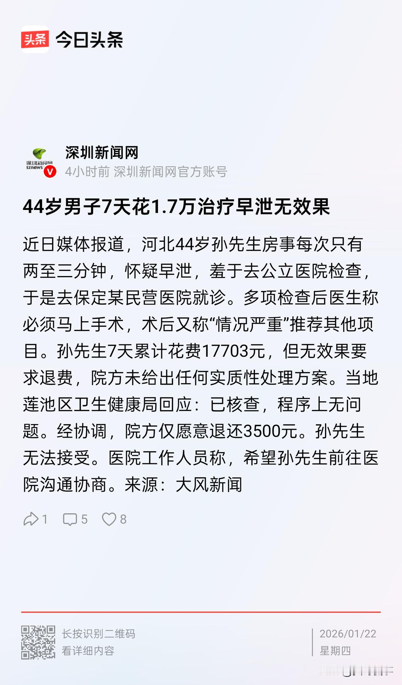 河北,一44岁男子因男性问题,羞于去正规的公立医院看病。思来想去,他选择了一家当地的民营医院。来到医院做完检查后,男子就被安排手术、仪器治疗等多个项目。短短7天的时间内,男子就花去了17000余元,但效果甚微。事后,男子后悔直言:“钱没少花,罪没少受,还没效果,太气人了!” 孙先生刚年过4旬,按理说正是身强体壮的年龄,但因为夫妻生活不睦,孙先生心里憋了不少委屈,这也让他对自己的身体产生了怀疑。 为了治病,孙先生羞于向亲友倾诉,也没有直接去公立医院做检查,反而拿起手机,在网上搜起了男科治疗的相关信息。 最终,孙先生被保定一家民营医院的宣传所吸引,决定独自前往治疗。 来到这家医院后,孙先生就被安排进行多项检查,接诊医生更是表示必须立即进行手术。 这还不算完,在此后的几天内,医院更是给孙先生安排了安排了热电波、温控、红光等一系列仪器治疗,还需每日输液。 孙先生本想着先治着看,可每天的治疗账单让他心惊,单日费用就近一两千元。 从短短7天的时间内,各项检查、理疗、输液费用加起来,累计高达17703元。 更让他崩溃的是,钱花光了,罪也受够了,身体的不适没缓解,早X问题依旧存在。 孙先生是又气又后悔,便找到医院要求退费,可院方始终没有给出任何实质性的处理方案。 无奈之下,孙先生又向当地卫健局反映情况。经卫健局核查,给出的回应却是医院诊疗程序上无问题,经从中协调,院方最终只愿意退还3500元。 区区3500元,连总花费的五分之一都不到,孙先生无法接受这样的结果。 而医院工作人员对此仅表示,希望孙先生再到医院沟通协商,事情至今没有妥善解决。 对此,网友议论纷纷,有人说:“真是搞不懂孙先生,就因为羞于启齿,放着正规公立医院不去,偏信民营男科医院的话,这不就是明摆着往坑里跳吗?这番操作属实太荒唐了。” 也有网友表示:“这家医院的套路也太明显了吧,先吓唬人说要马上手术,做完又说病情严重,接着推高价项目,这不就是逮着患者的隐私痛点宰吗?卫健局说程序没问题,难道程序合规,就能随便过度治疗、乱收费了?” 还有网友调侃:“去公立医院怕羞,难道去私立医院就不羞了?” 的确,大家通常看病,一般都会去公立医院,不是说私立医院不好,而是公立医院有着严格的诊疗规范和收费标准,不会随意夸大病情、诱导消费,更不会借着患者的隐私痛点漫天要价; 而部分民营医院为了盈利,容易出现过度检查、过度治疗的情况,尤其针对男科、妇科这类隐私病症,更是抓住患者羞于启齿、急于治病的心理设下套路。 像孙先生的这种情况,就有可能中了套路。 要说他经这一遭把病治好了还好,花点钱倒也无所谓。关键是钱花了,没效果,还受了不少罪,他这又是图什么呢? 如果治疗不好,反而加重了病情,这不是适得其反吗? 对此,你怎么看?欢迎大家在评论区留言。