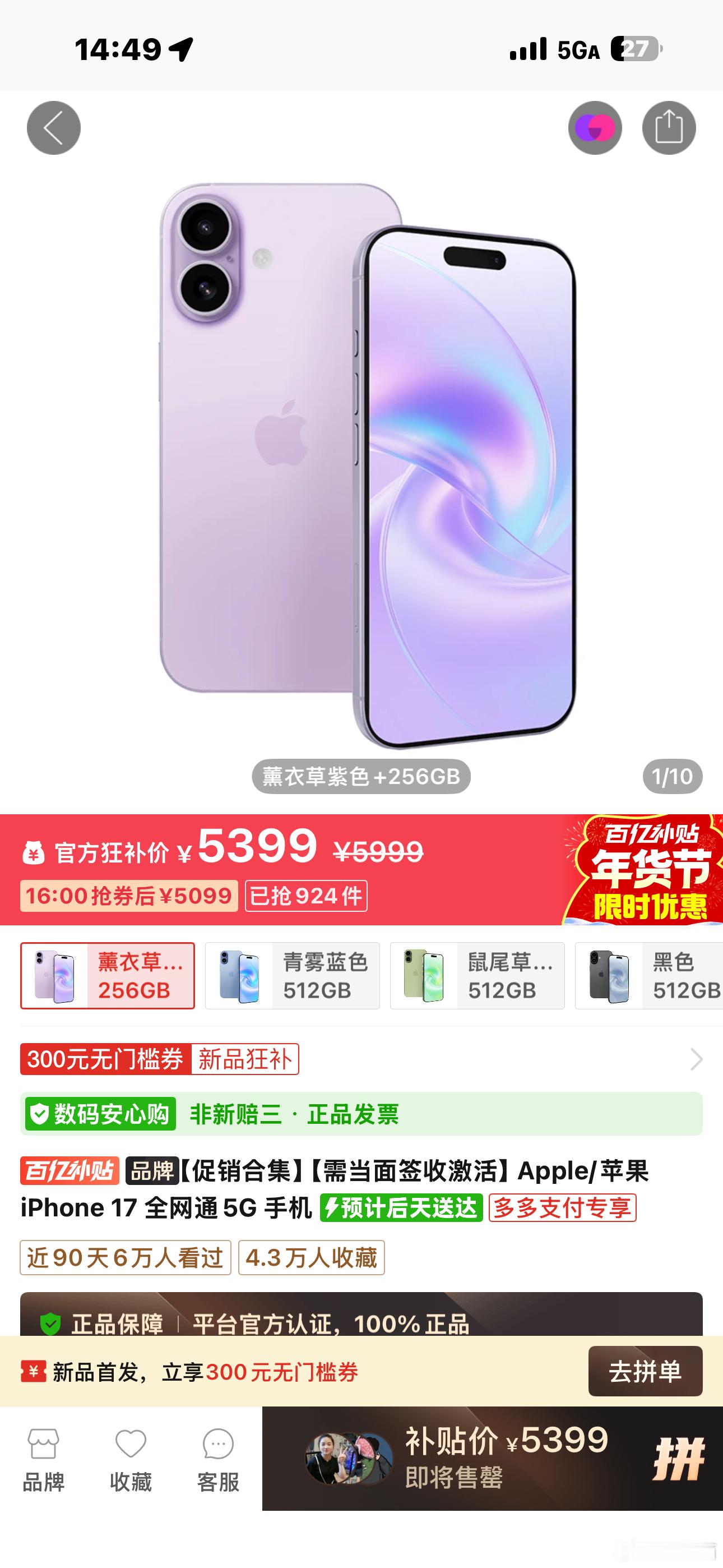 iPhone 16目前在苹果官网只有128GB版本,价格5399元,新春优惠300元,到手价5099元。某某第三方渠道,也是5399元,还可以抢300元的优惠券,最后价格也是5099元。不过还是有区别的。第三方渠道是iPhone17,而且是256GB版本