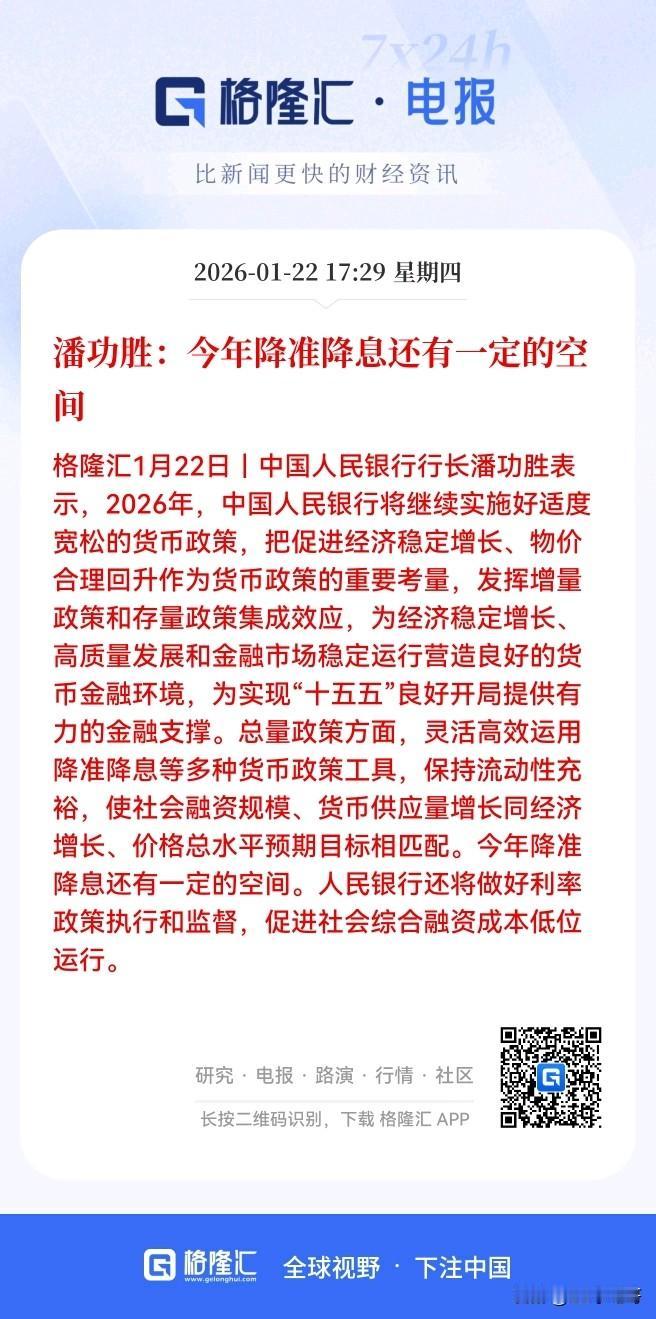 盘后大利好!明天A股有望长虹了吗? 今天盘后主要有两个利好: 一是央行行长在接受采访时表示2026年,中国人民银行将继续实施好适度宽松的货币政策,今年降准降息还有一定的空间; 二是央行公告为保持银行体系流动性充裕,2026年1月23日(也就是明天),中国人民银行将以固定数量、利率招标、多重价位中标方式开展9000亿元MLF操作,期限为1年期。 大家看央行盘后的这两个消息,是不是对于A股是利好?大有希望推动明天大A继续长虹? 无论是央行行长的内容,还是明天9000个亿MLF的操作,这都是实打实的为A股注入流动性,注入信心。 一月份以来,A股的成交额明显大幅放量,一度维持在3万亿之上,现在也是在2.5万亿左右。这样的流动性无疑非常利好A股的不断走高,形成真正的慢牛行情。 现在盘后又来了两个利好,明天大A股再次给大家回血的概率是非常大的!