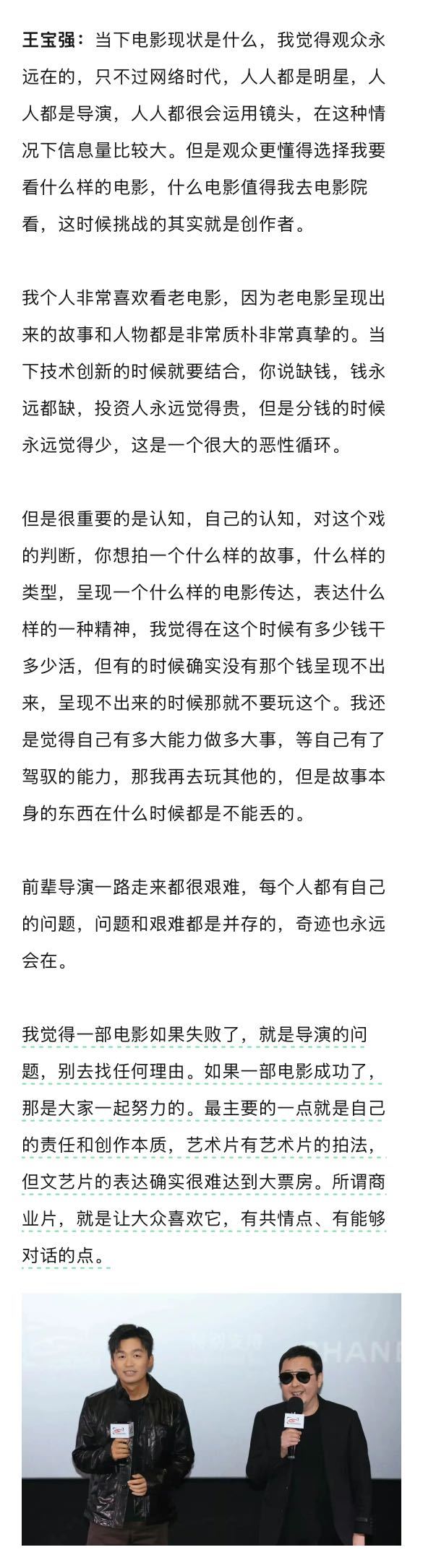 王宝强说电影失败是导演的问题华策说寻秦记的票房超出预期 1992年,在吴思远、李行、谢铁骊、吴贻弓、谢飞等前辈导演的推动下,海峡两岸暨香港电影导演研讨会的机制得以建立。会议日期定在1月11日,意为大陆、台湾、香港三地电影导演的相聚,代表着大家欢聚一堂,也代表着团结一心。之前,研讨会一直由三地轮办,但从2017年之后中断举办。时隔8年,会议重启,在“步履不停”“新技术浪潮中的电影创作”“新目光,向未来”三个主题下,导演和电影人深入对谈。新浪娱乐工作室从三场对谈中摘录了一些代表性的思考与分享。王宝强:前辈导演一路走来都很艰难,每个人都有自己的问题,问题和艰难都是并存的,奇迹也永远会在。我觉得一部电影如果失败了,就是导演的问题,别去找任何理由。如果一部电影成功了,那是大家一起努力的。最主要的一点就是自己的责任和创作本质,艺术片有艺术片的拍法,但文艺片的表达确实很难达到大票房。所谓商业片,就是让大众喜欢它,有共情点、有能够对话的点。邵艺辉:很多电影讲的是人类的经典命题,比如我自己创作的两部电影都是围绕亲情、友情、爱情,就是人的关系,我也相信近十年可能都不会有太大的改变,因为过去百年其实也没有太改变,而且很多故事和情感类型也都被讲尽了,我们只能想办法看怎么能用新的方式,其实新的方式也挺少的,看怎么能把它再重新拼凑一下。而且我创作的时候也会考虑到,如果太有时效性,包括像网络热词、热梗,虽然它也会好笑,但是很可能明年就不会好笑了,我们创作者都会有意识地避免。华策影业万娟:因为最近在上《寻秦记》,《寻秦记》在内地的票房实际是有超出大家预期的,我也可以跟大家分享。上映前它跟大量港片的人群画像是接近的,都在两广区域,但是这部片子根植于IP粉丝,它有触达到华东,包括江苏、浙江、四川这些票仓城市的IP受众,所以如何从前端策划到后端发行去满足一个垂类内容的研发和发行,可能也是我们当下的一个课题。博纳影业于冬:每年500到1000部产能的这些导演们、这些制作能力会向短剧、剧集释放。介质的改变让所有做内容公司的同仁都在考虑我们怎么布局2000亿的市场,这是未来的一个大机会,也是青年导演成长的大空间,它自然也带动了从短剧到剧集,到电影整个产业链内容创作阶梯性的培养阶段,也为我们今天海量的内容制作方提供更多的舞台。更多内容,请戳…娱理独家↓