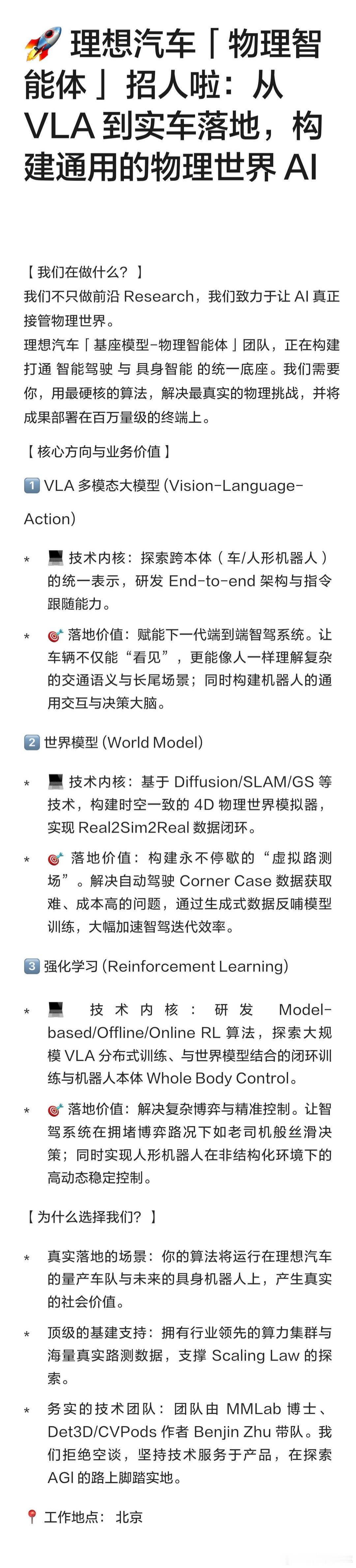 以后搭载 M100 芯片的不止是汽车了?理想的人形机器人团队正在搭建当中,招聘涉及灵巧手、双足、关节模组等,软件则是汽车同源的 VLA、RL、WM;从汽车、理想同学、AI眼镜到机器人,理想的 AI 生态版图正在持续扩大中。理想汽车人形机器人