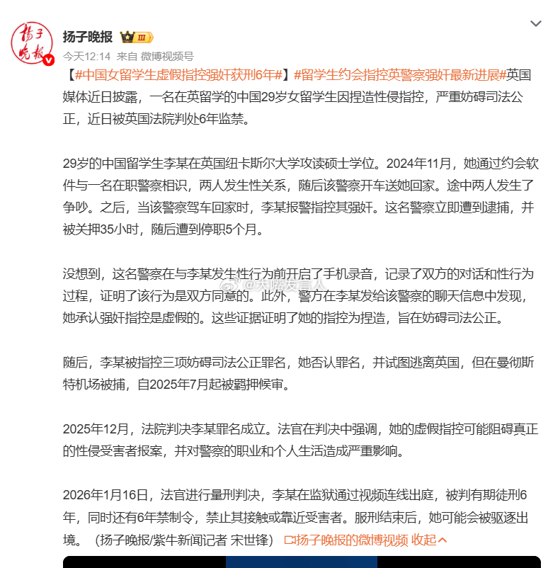 中国女留学生虚假指控强奸获刑6年 难道英国,就不承认“同意可以撤销”吗? 对呀,她当时可能确实同意了、或者没有明确表示反对,但她事后想撤销呀、想表示不同意呀,英国法官这都不支持呀,英国太腐朽了留学生约会指控英警察强奸最新进展,热点观点