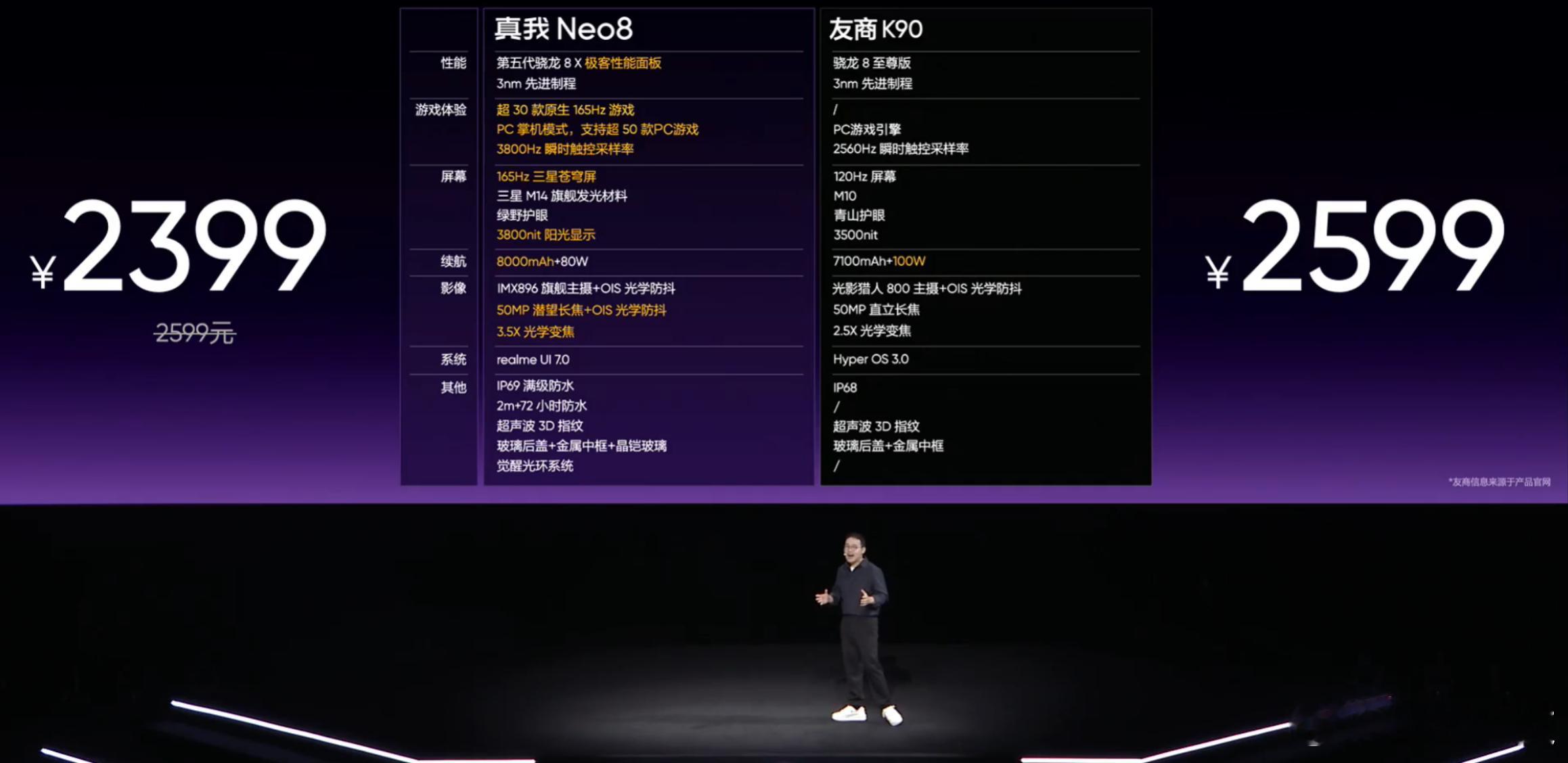 针对性极强,对比的友商K90,要低200。真我Neo8(骁龙8 Gen5)12+256GB 2399起~