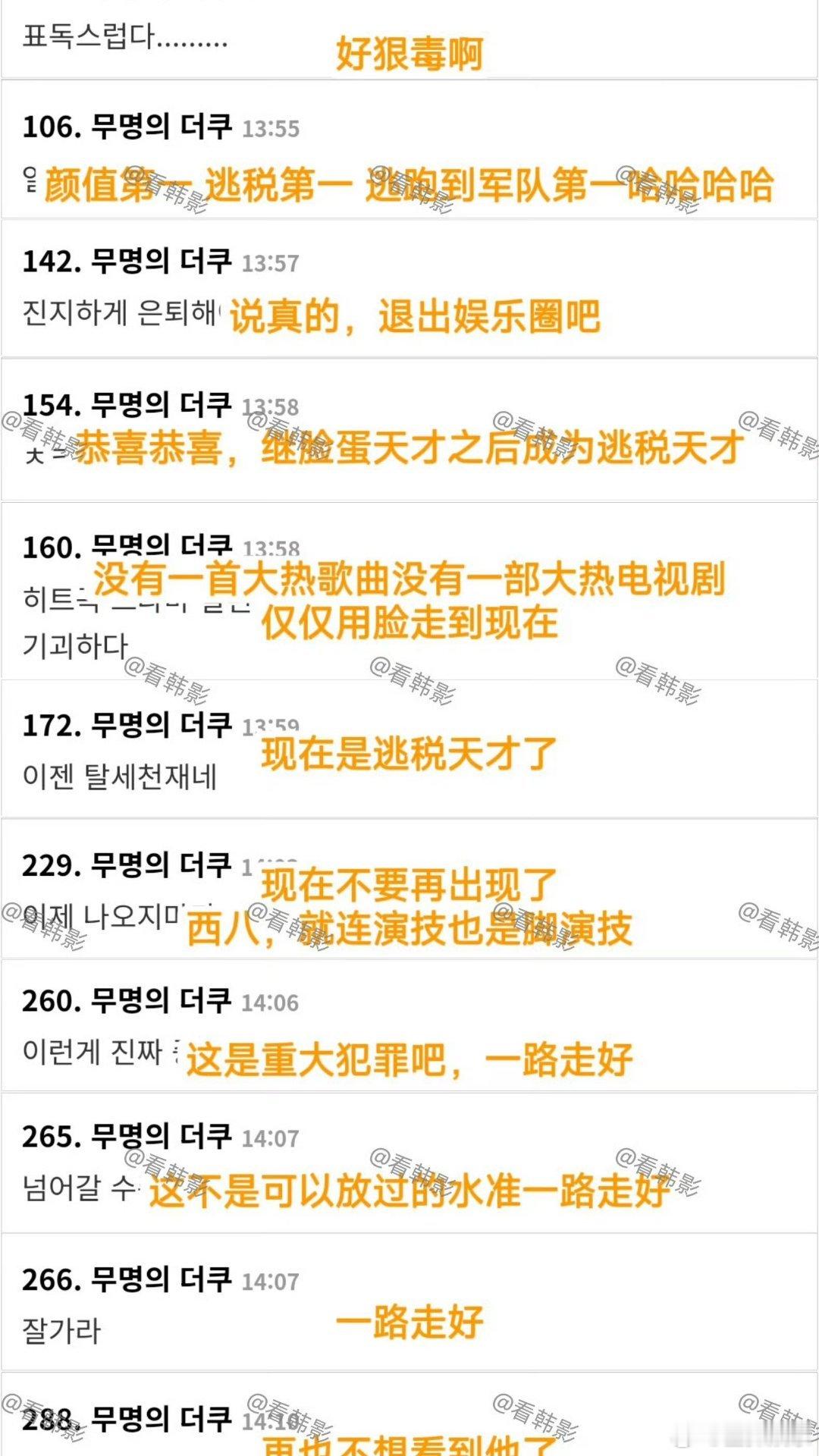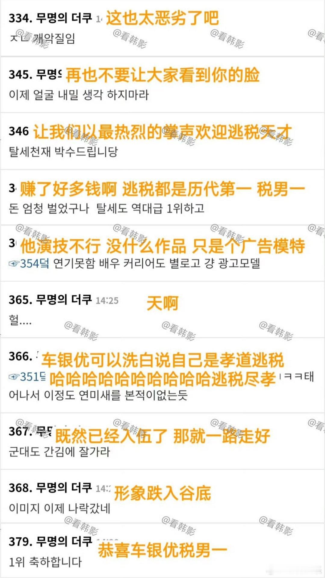 车银优被韩网友喊话退圈车银优因涉嫌通过母亲公司逃税200亿韩元被查,韩网刷屏喊退圈。人设崩塌,代言也开始悄悄下了。他本人已经入伍,结果却是等他入伍后才公布,这波操作网友也质疑是“特权保护”。
