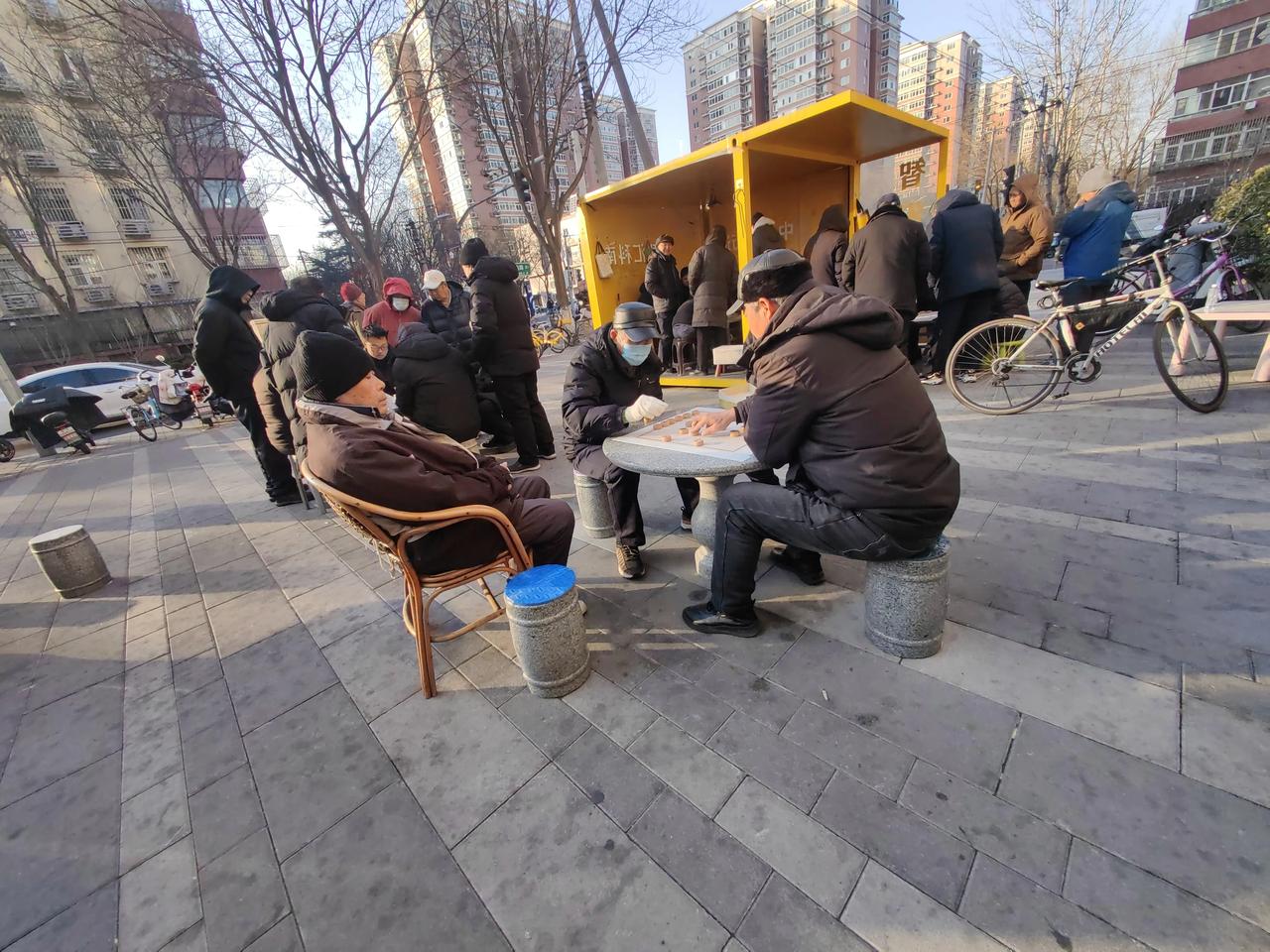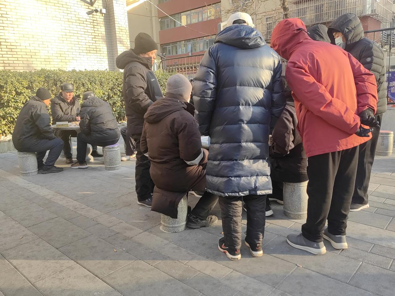 冷在三九,气温零下八九度,真有不怕冷的人,我真是佩服他们,简直是太敬业了。 在我们租住的小区门口,每天都有五六桌下象棋的,棋桌四周站满了人,有的人观棋不语,有的人出谋划,看棋的人比下棋的都着急。 象棋是爱好者们凑份子买的,下棋的桌子是物业提供的。 下棋的看棋的基本上都是老年人,象棋成了他们晚年生活的乐趣。