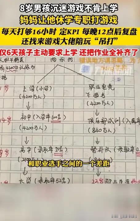 如何看待家长采取的这种措施? 湖北武汉,一个8岁孩子迷上手机游戏,家里不打不骂,干脆给他办了休学,一周按表玩,每天从早上八点到夜里十二点,加起来十六小时。 这个案例反映出家庭在应对孩子沉迷手机游戏时采取了一种特殊的方式,即通过休学和制定严格的作息时间来控制孩子的游戏时间。 具体来说,家长选择让孩子休学,每天按照固定的时间表玩游戏,从早上8点到晚上12点,共计16小时。 这种做法可能出于以下几种考虑: 控制游戏时间:通过安排固定的时间段,避免孩子随时随地沉迷游戏,试图让孩子在有限的时间内满足娱乐需求。 避免争执:家长可能觉得打骂无效甚至会激化矛盾,选择用这种方式试图让孩子接受并习惯于有限的娱乐时间。 暂时缓解压力:休学可能是家庭在尝试减少孩子的压力或焦虑,提供一个“逃避”游戏的空间。 然而,这样的做法也存在一些争议和潜在问题: 心理健康影响:长时间沉迷游戏可能影响孩子的身体健康、学习能力和社交发展。 教育和成长:休学可能影响孩子的学业和未来发展,长时间专注于游戏可能会错失学习和成长的机会。 家庭沟通:单纯限制时间可能不能解决根本问题,家庭还需要与孩子沟通,理解其兴趣和需求,帮助其建立正确的价值观。 总体来看,这个案例反映出家庭在面对青少年沉迷问题时的无奈和尝试,但也提醒我们,解决类似问题应结合心理疏导、家庭教育和专业帮助,而非单纯通过限制时间或休学来应对。