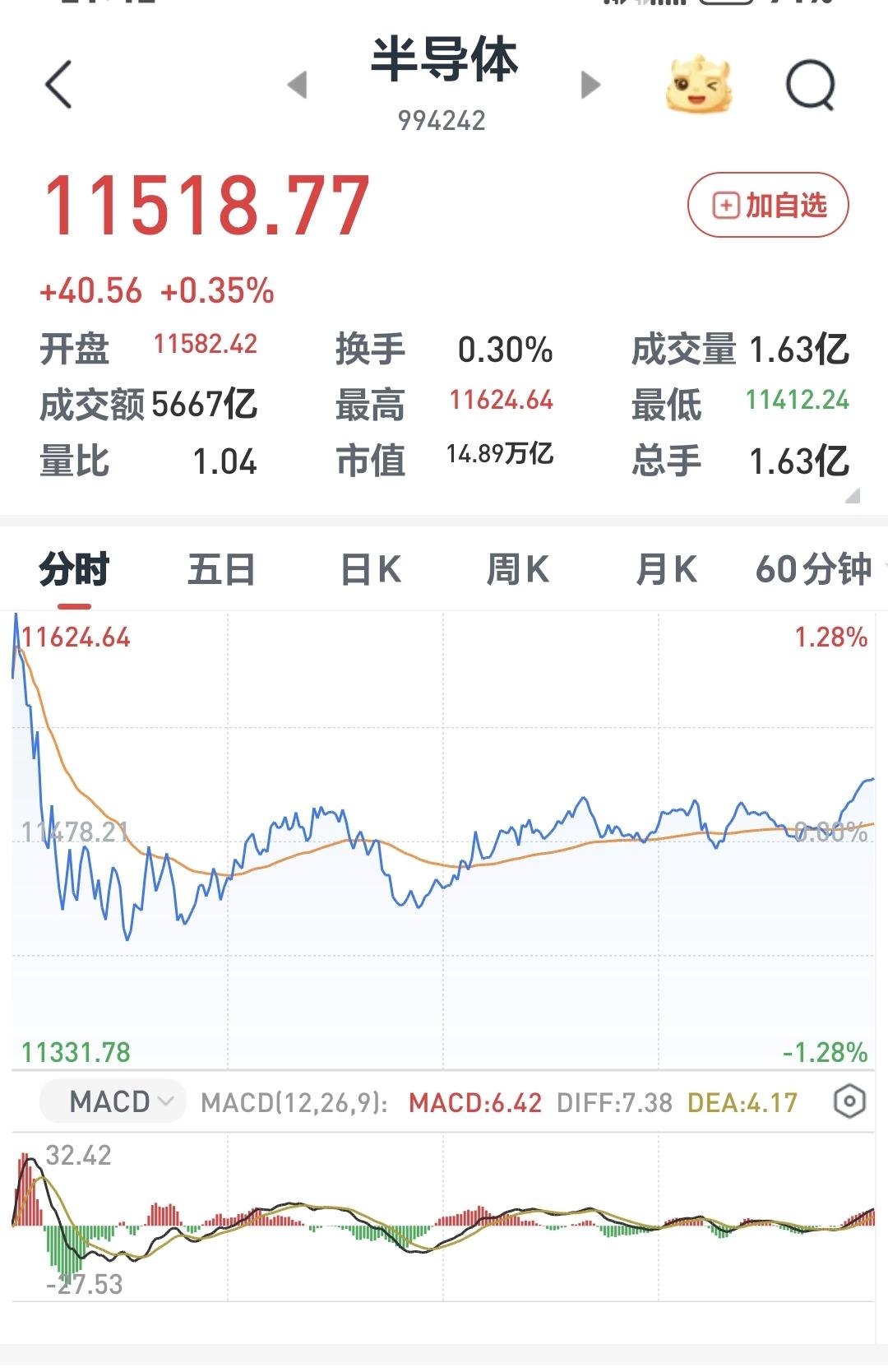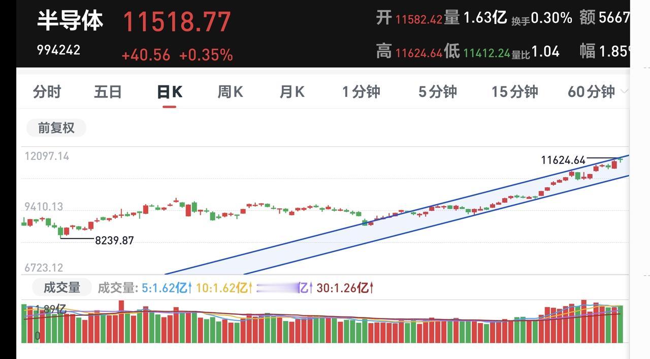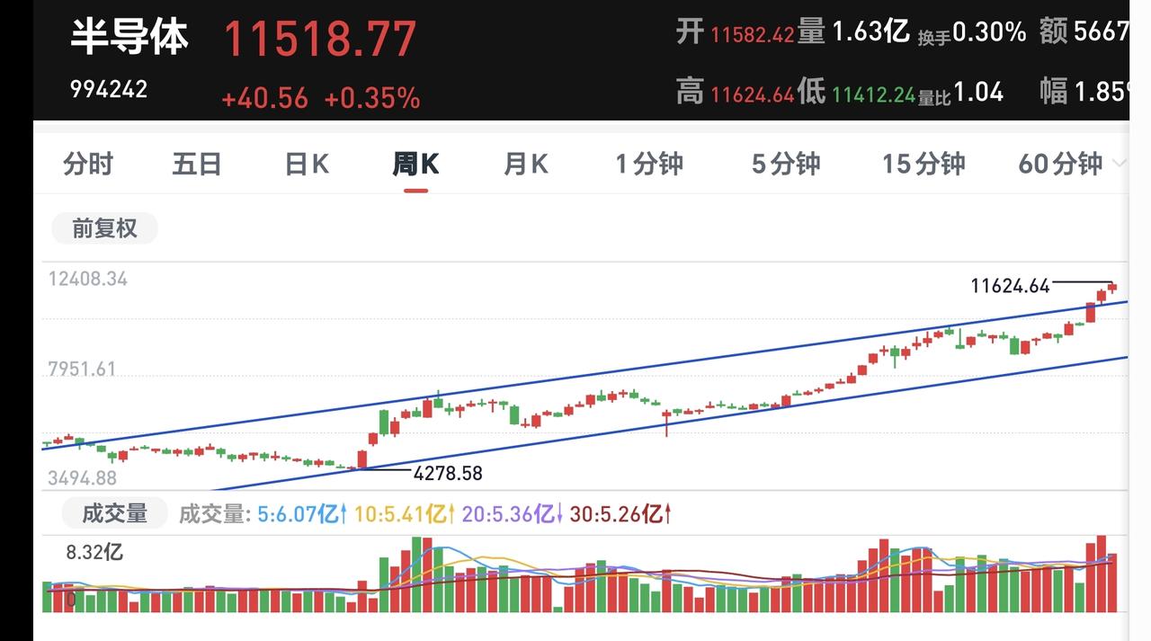 基金:半导体板块冲高回落的原因找到了 半导体板块今天开盘以后急涨,一度是上涨幅度靠前的板块,但随后直线向下,低位震荡至收盘,许多人不知道是什么原因。 看下面的截图2,这是半导体板块的日K线图,我画了两条倾斜向上的斜线,这是半导体板块日线级别上涨通道,今天上涨的最高点,正好打到了这个上涨通道的上轨线上,然后才进行了回落,这就是今天冲高回落的主要原因,因为,这个上涨通道的上轨线是一个压力位置,如果上涨突破了这条上轨线,这个板块就会进入加速上涨阶段,但今天的冲高回落并没有改变日线级别的上涨趋势,现在还处于上涨通道中,持有的人当然是可以继续持有。 看下面的截图3,这是半导体板块周K线图,半导体板块周线级别也是处于上涨趋势中,而且是已经突破了上涨通道的上轨线,这个时候如果日线级别再走加速走势,就会是热上加热,主力资金是不愿意冒这个险的,现在有关方面是在防止市场过热,半导体板块不想做这个出头的椽子,俗话说出头的椽子先烂,这说明半导体板块的主力资金志在高远。 不管他近期怎么走,持有的人只要盯住上涨通道的下轨就可以了,这个上涨通道的下轨线就是我们的持有条件,只要不跌破这个上涨通道的下轨线就继续持有,除非大盘出现明显的顶部特征。
