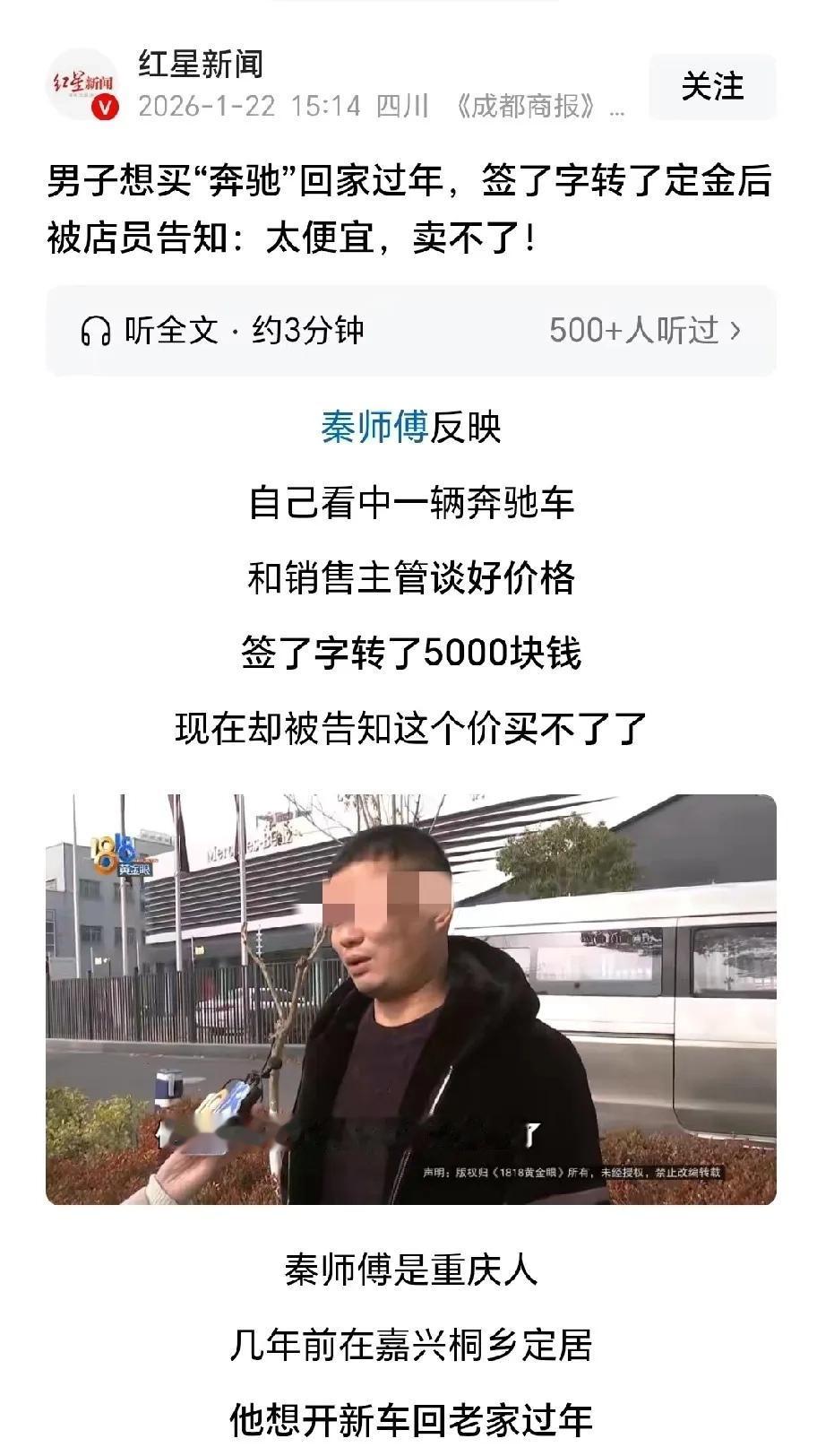 重庆男子订奔驰过年撑面子,签单转定金后4S店反悔,法院:不算违约!原因扎心 重庆秦师傅眼瞅着要过年,心里就一个想法,买辆奔驰开回老家,既能风风光光过年,也能让亲友看看自己这些年打拼的成果,说出去也有面儿。 思来想去,他看中了奔驰C350eL的白色款,大气又上档次,当即拉着爱人直奔4S店,打算赶紧定下这车。 到店后秦师傅围着车子转了好几圈,内饰、配置都看得明明白白,越看越满意,立马找销售主管谈价格。他一边跟销售磨优惠,一边算着自己的预算,一番讨价还价下来,终于谈妥了价格。 双方当场签订《新车报价单》,上面特意手写注明:落地260300元,含15000元置换补贴,实际原价275300元。秦师傅本就打算拿家里旧车置换,刚好能享15000元国补,算下来这个价格完全在预算内。 价格谈好,秦师傅又接着要赠品,销售主管也很爽快,当场答应送新车脚垫、后备箱垫、全车贴膜、新车除味,还额外给2万公里的保养,秦师傅觉得这买卖太值了,心里美滋滋的。 为了让这事板上钉钉,秦师傅当场微信转了5000元给销售主管,还特意备注了“定金”二字,销售主管回复“收到”后,也在报价单上签了字。秦师傅心里的石头彻底落地,开开心心回了家,就等着提车返乡过年。 可谁能想到,第二天秦师傅就接到了销售主管的电话,对方开口就说昨天谈的价格太便宜,公司批不下来,这车卖不了。 秦师傅当场就火了,价格是当面谈好的,字也签了,定金也转了,怎么能说变卦就变卦?他在电话里和销售争执不休,坚持要按约定价格提车,可对方态度坚决,一口咬定这个价格绝对做不了。 这时候秦师傅才发现,自己备注“定金”转出去的5000元,竟然已经自动退回来了。他赶紧追问销售,对方一开始说还在向集团申请,后来干脆直接摊牌,说车子涨价了,之前的价格没法成交。 秦师傅不死心,多次找4S店沟通,门店经理出面回应,说那张签了字的《新车报价单》根本不算正式购车合同,要是签的是正式合同,门店肯定按约定执行。 至于那笔退回的5000元,经理还说秦师傅说的“定金”和销售回复的“收到”,双方理解有差异,具体成交价还得再协商,可后续沟通毫无进展,4S店始终咬死260300元的价格卖不了,秦师傅的新车梦彻底泡汤,还惹了一肚子气。 很多人都替秦师傅抱不平,可从法律层面来说,这事还真没法强制4S店卖车。 根据《民法典》规定,定金合同自实际交付时成立,秦师傅的5000元定金自动退回,等于没完成交付,定金合同不成立,自然不能主张双倍返还。 而那张报价单,只写了车型、价格和赠品,没约定交车时间、付款期限、违约责任这些核心条款,不算正式购车合同,再加上秦师傅没付首付、没提车,购车合同没成立,4S店拒绝卖车不算违约。 不过秦师傅也不是完全没辙,他可以主张缔约过失赔偿,比如来回的交通费、误工费等合理损失,前提是要保留好相关证据。 这事也给大家提了个醒,年底买车旺季,订车时一定要签正式购车合同,定金务必确认到账,核心条款要写清楚,别像秦师傅这样吃了亏! 来源:红星新闻