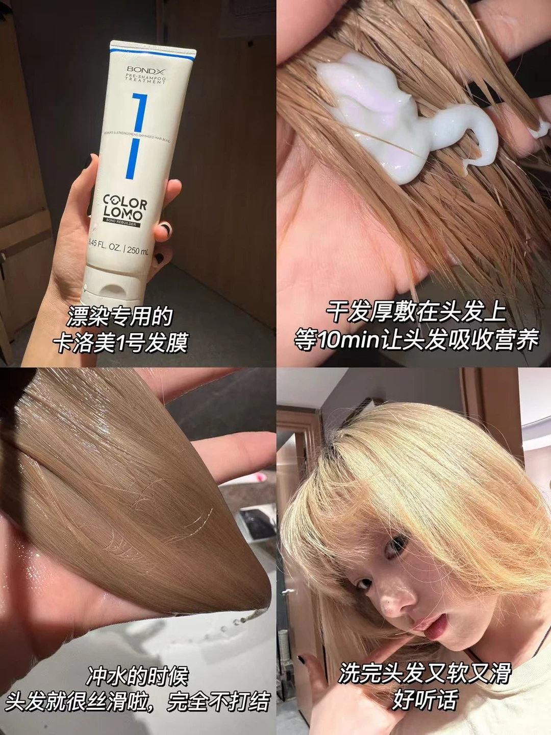 不中了不中了 漂完之后头发干的不行 每次洗头之前必须来一个三明治护理 用这个卡洛美1号发膜。先干发厚敷个十来分钟冲掉,然后再正常洗头 这款洗前发膜已经是第二次点名表扬了,怎么会这么好用啊小发膜 不过护发真的要坚持啊!!如果用一次两次就停了,头发直接被打回原形 还有这款发膜的香味必须要表扬一下!!淡淡的一点都不刺鼻! 洗完之后吹干头发变得特别顺,据说发质越差的使用效果越好~有需求的小宝们可以冲!!