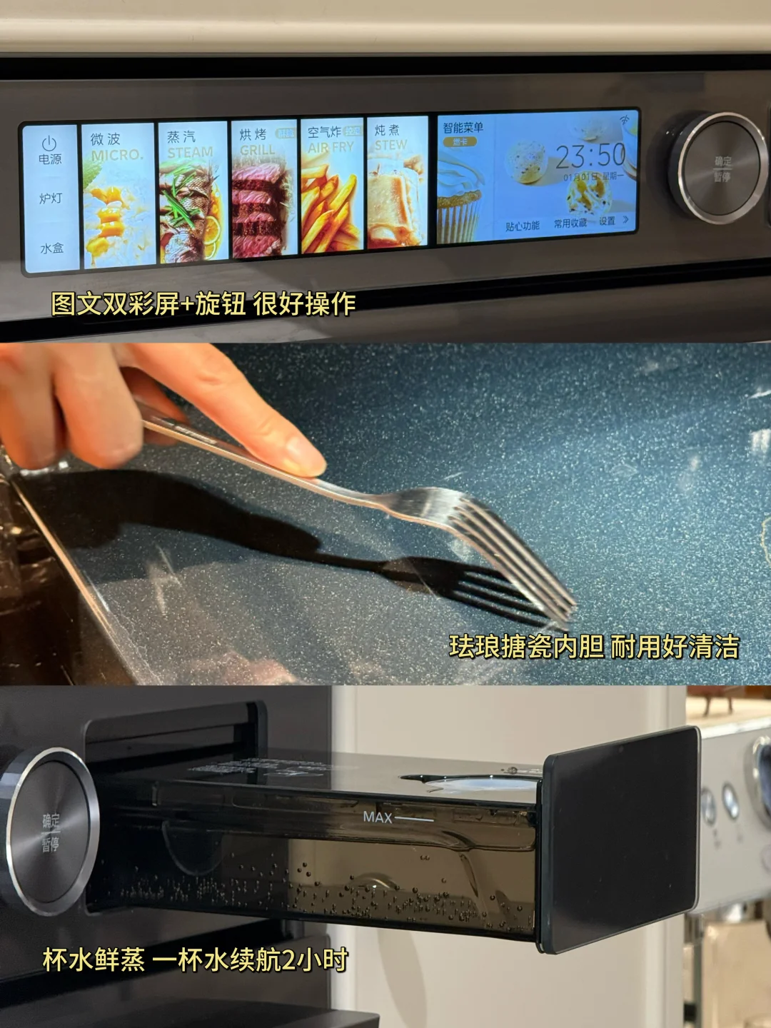 最戳我的是它的杯水鲜蒸黑科技,普通蒸烤箱1小时不到就得加水💦,它一杯水直接续航2小时,蒸一整桌菜都不用中途折腾!做完饭珐琅搪瓷内胆一擦就干净,还耐刮擦,清洁特别省心~