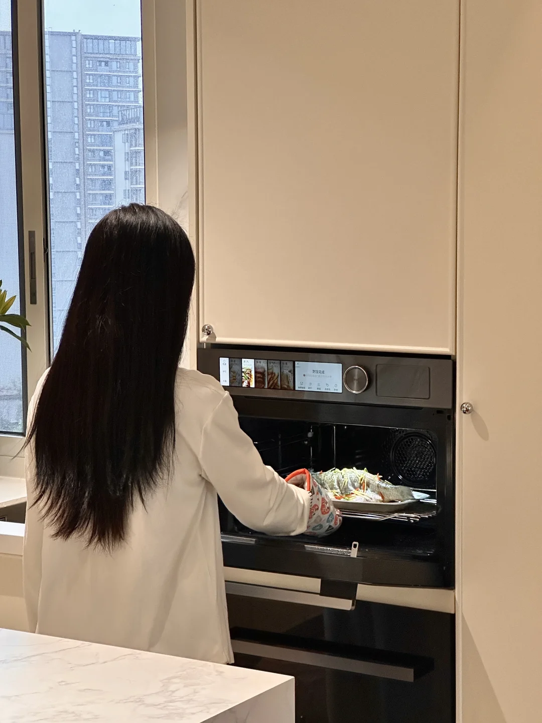 60L大容量,周末朋友来聚餐,烤个整鸡、蒸一盘海鲜都绰绰有余。关键是它的蒸汽冷凝回收太绝了!蒸鲈鱼🐟、炖排骨汤都不会有蒸汽乱飘,柜门打开也不烫手,橱柜一点没受潮。
