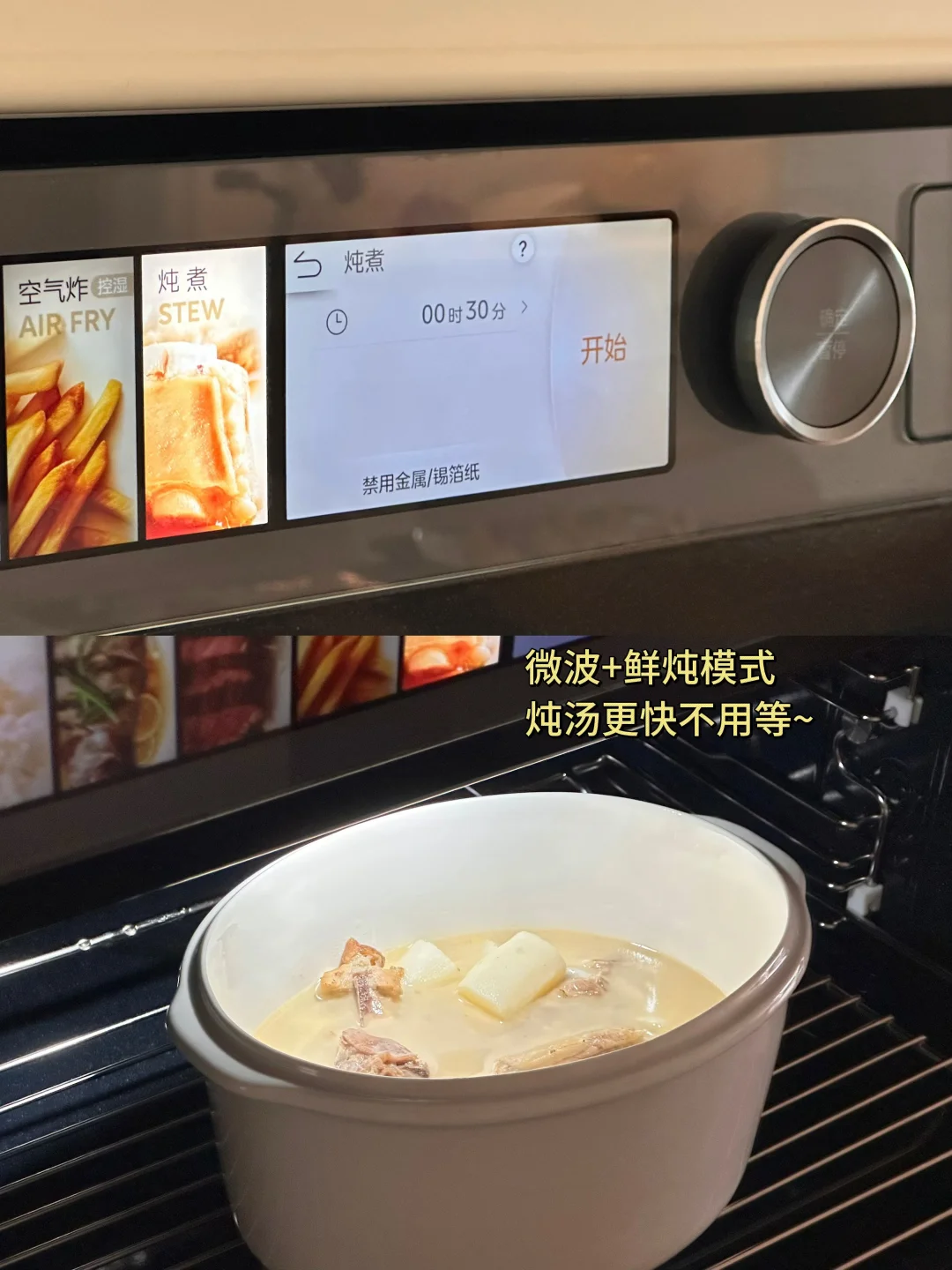 炖汤更是省心,它可以在蒸烤炖的基础上叠加微波,双重火力下,炖汤对比明火烹饪时间直接缩短一半时间,炖出来的汤更鲜、嘌呤少还更健康🍃。