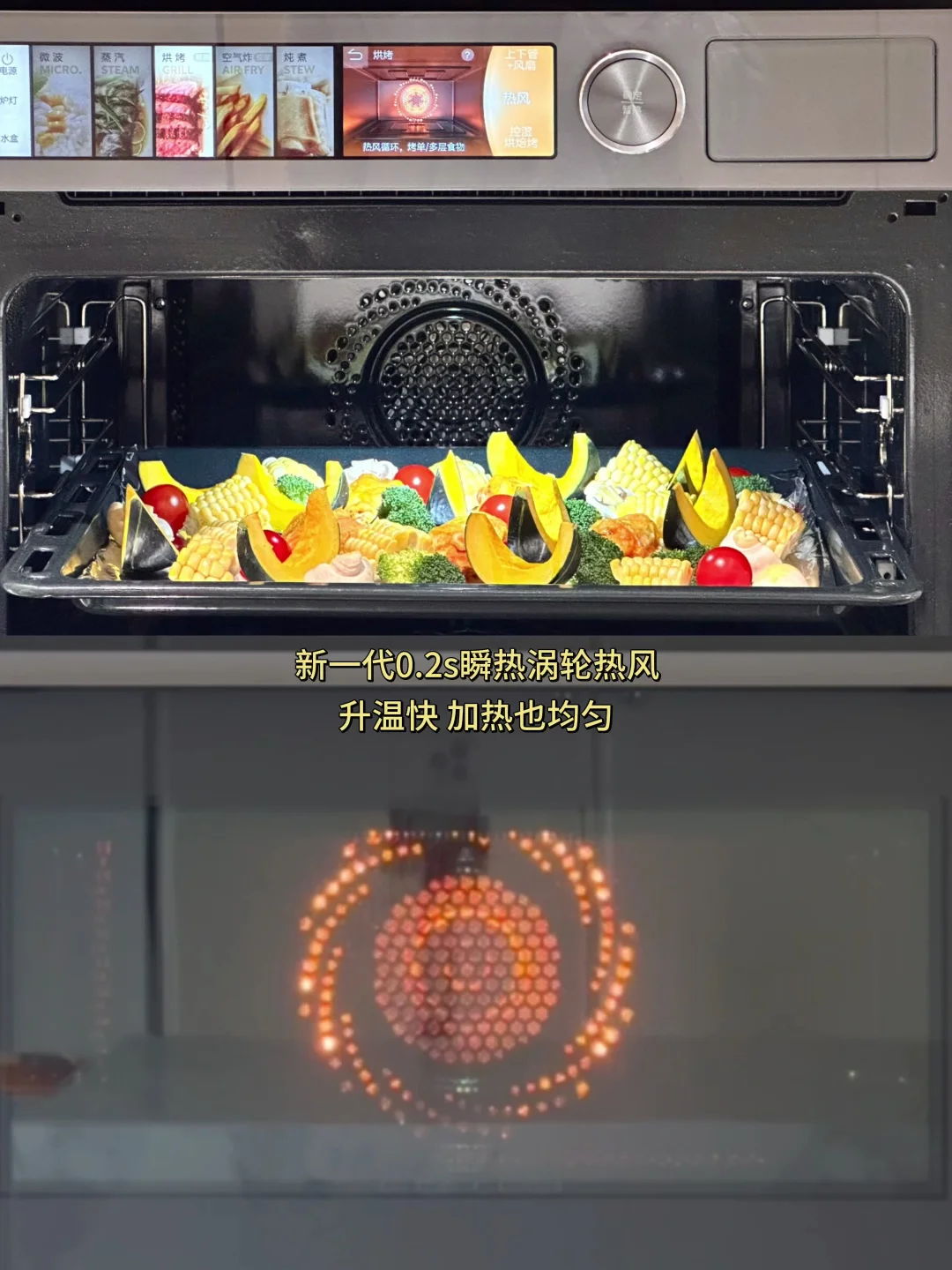 它的新一代0.2秒瞬热涡轮热风🔥,启动瞬间就能迅速升温,完全不用等预热~而且大热风比双热风更均匀,加上上下双烤管还能独立控温,像烤得外焦里嫩、色泽均匀而且机器能根据食物状态智能排湿补湿,老人爱软烂、小孩喜酥脆,一家老小的口味全满足!