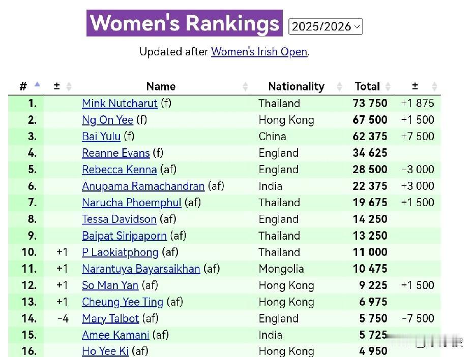 WSF女子锦标赛半决赛刚刚结束,白雨露与吴安仪晋级决赛,明天争夺冠军。 12名球员参赛的WSF女子锦标赛,是女子斯诺克排名赛之一。两个小组循环赛结束后,获得前8的球员进入淘汰赛(1/4决赛),不出意外,白雨露、旺哈鲁泰和吴安仪3名职业球员进了8强。 1/4决赛,白雨露3-0战胜亚历山德拉,吴安仪3-0战胜旺哈鲁泰,双双晋级半决赛。另外两名晋级半决赛的球员均来自泰国,分别是纳鲁查和潘查亚。 今天晚上的两场半决赛实际上就是中泰对决,结果白雨露4-0零封纳鲁查,其中第3局打出单杆131分;吴安仪4-2胜潘查亚。 北京时间明天晚上9点,决赛将在白雨露与吴安仪之间进行。 顺便说一下,WSF女子锦标赛奖金虽然不高,但积分不低,冠军将获得7500分的积分,亚军4875分,前4名也有3000分。 目前女子积分情况是:闵克(旺哈鲁泰)第一,积分为73750,吴安仪第二,积分为 67500,白雨露第三,积分是62375。 白雨露本赛季需要保级,女子排名第一可以获得职业资格,本赛季还有几站女子排名赛,白雨露,加油!