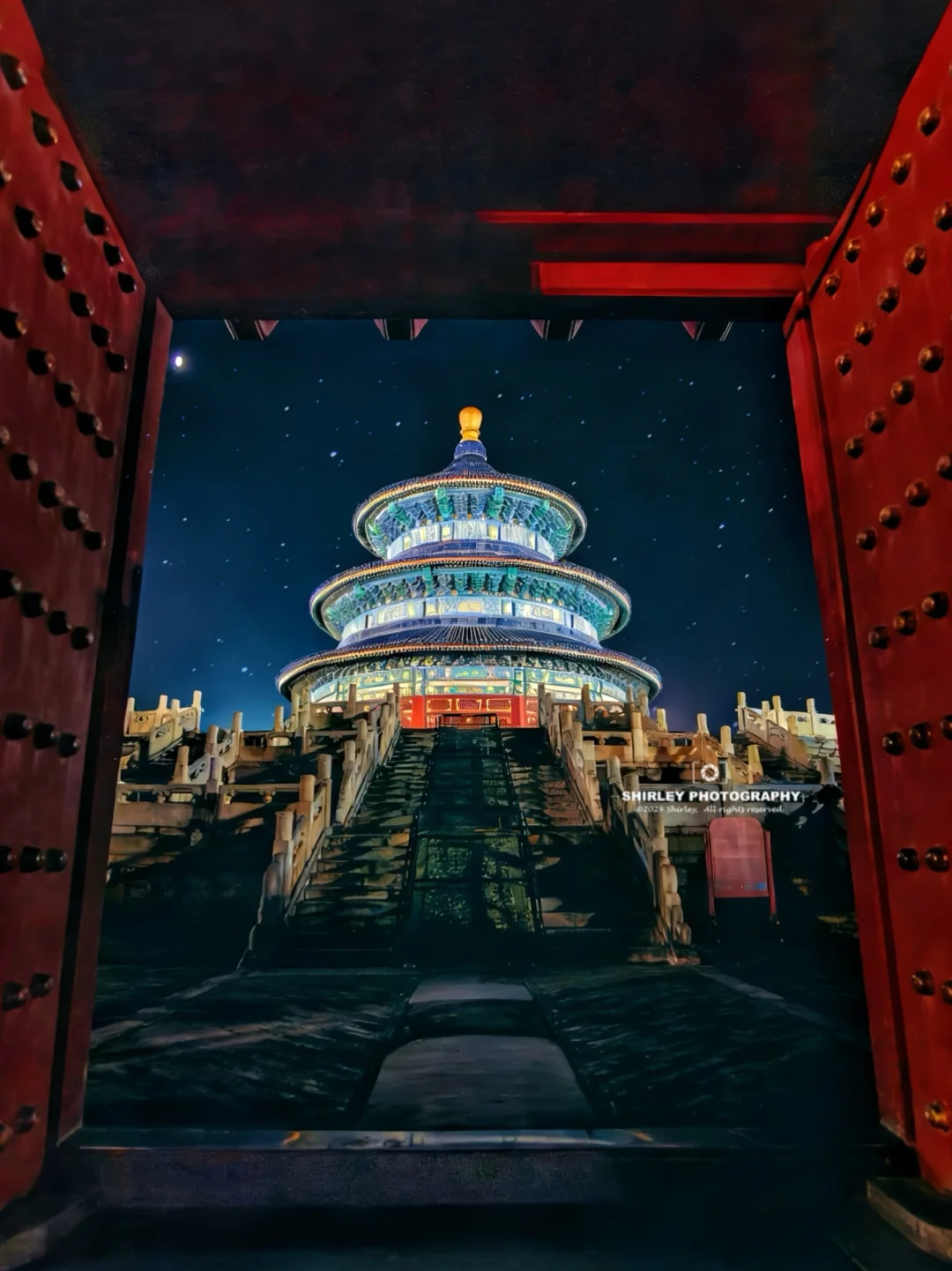 以皇乾殿的门框为画框,蓝调时的祈年殿如披着圣光的神殿