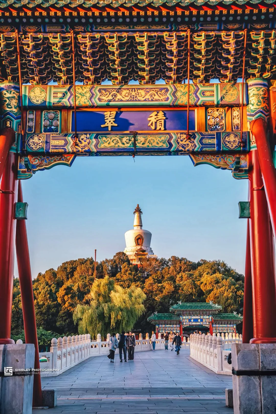 以永安桥与积翠牌楼作为前景,白塔与蓝天意境悠远