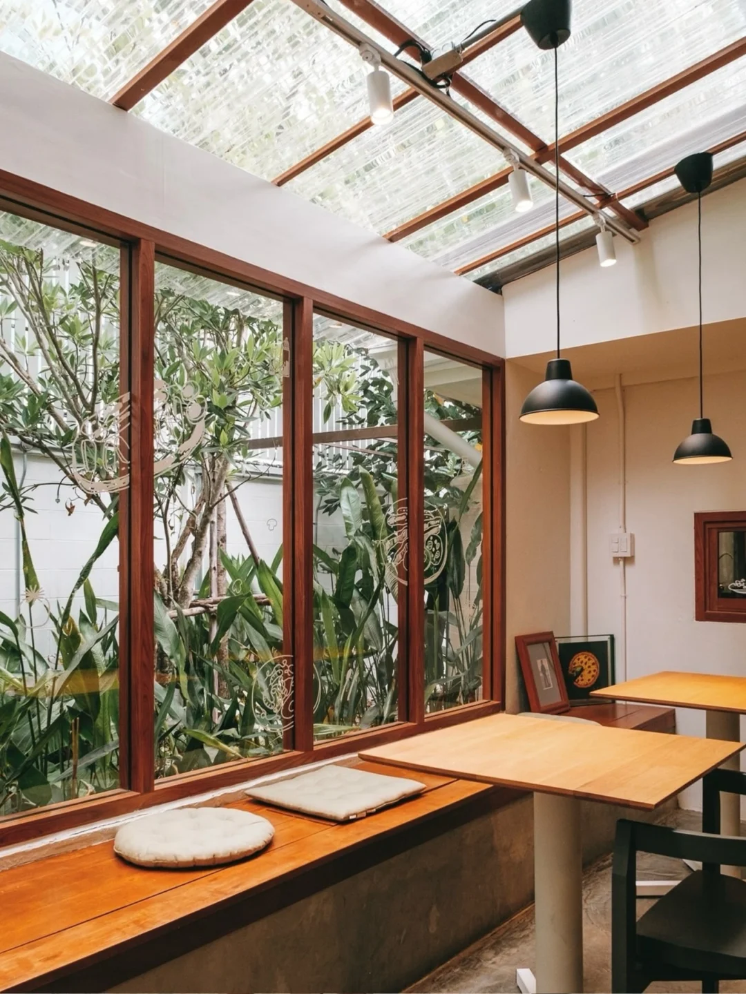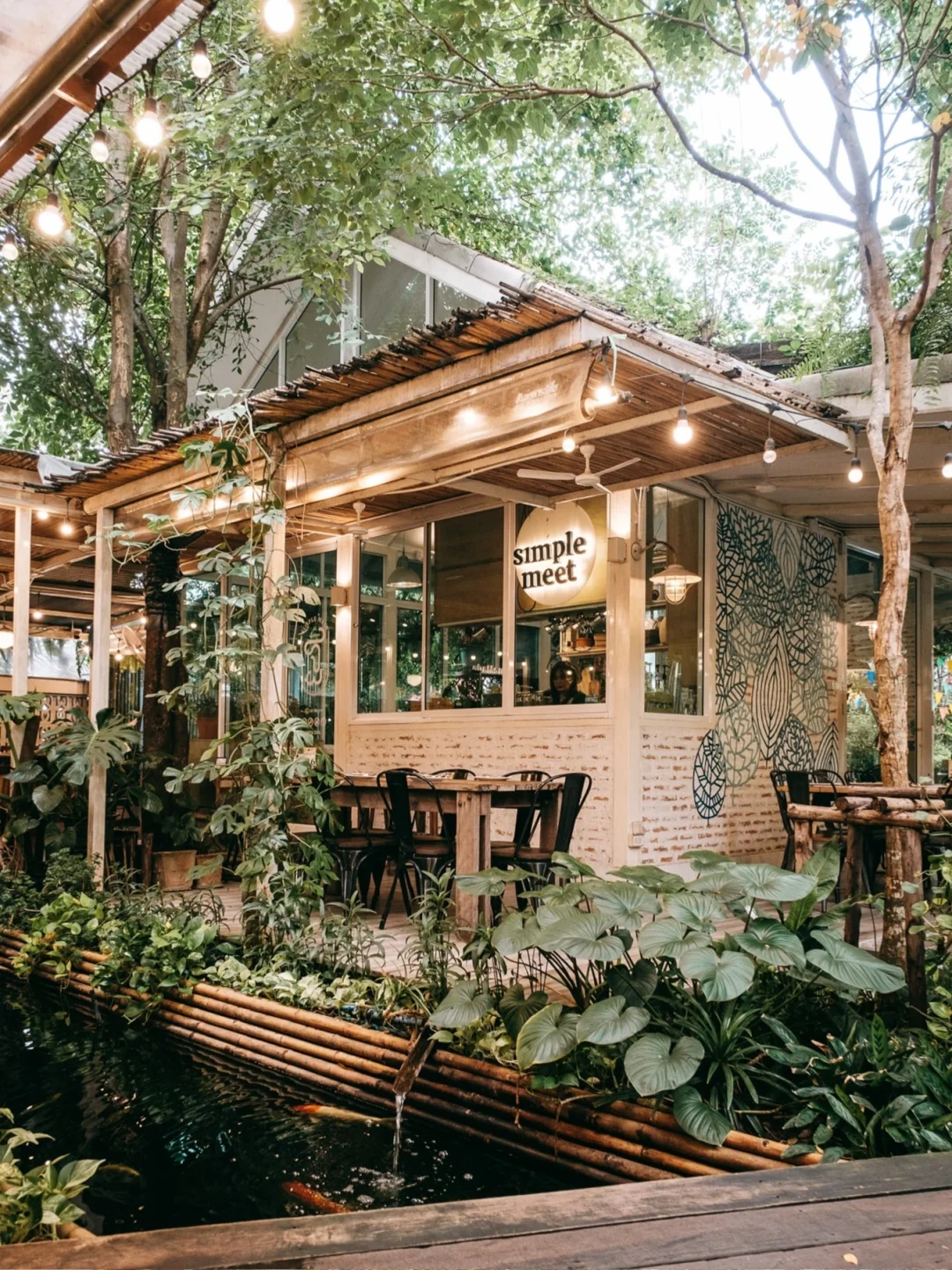 🌳 建筑是一栋复古风格的白色玻璃房。周围郁郁葱葱的绿树环绕,让人心旷神怡。店里还有一条小溪,五彩斑斓的锦鲤鱼儿活泼地游动着