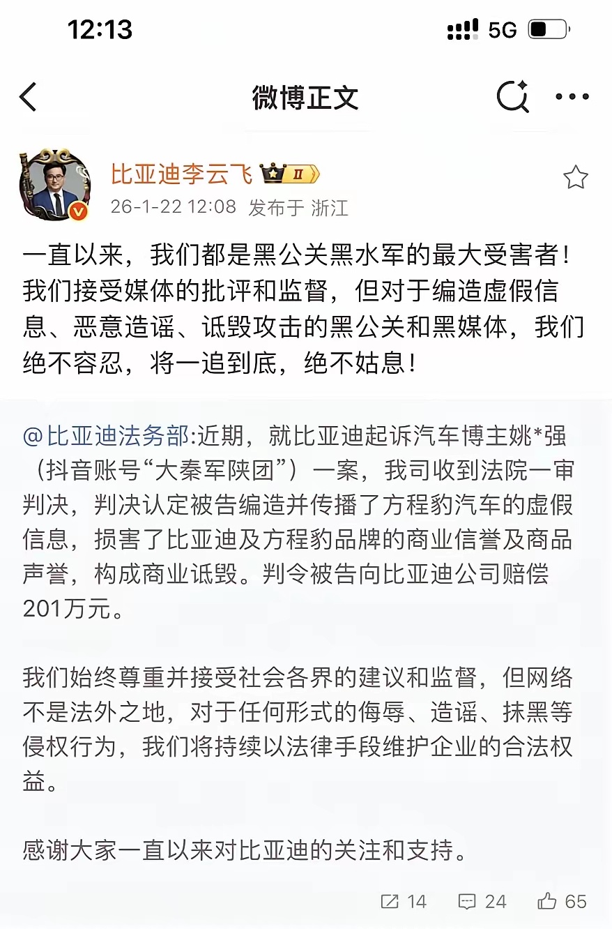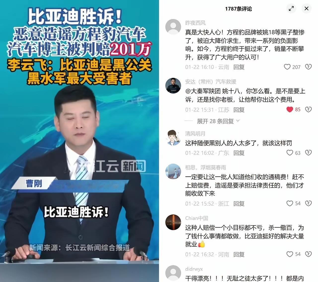 大快人心!又一个网络黑子被判了!王传福对网络黑子是一点也不惯着!抖音博主“大秦军陕团”被判商业诋毁,赔款坐牢是没跑了!因为诋毁方程豹油耗18L被送外号“姚十八”!关于诋毁方程豹一案也尘埃落定,法院认定姚某强编造并传播虚假信息,判赔201万元!要不说互联网是有记忆的,任何捏造传播虚假信息的,都会付出应有的代价!这次姚十八也算是求锤得锤了,估计以后再也不会胡说八道了!