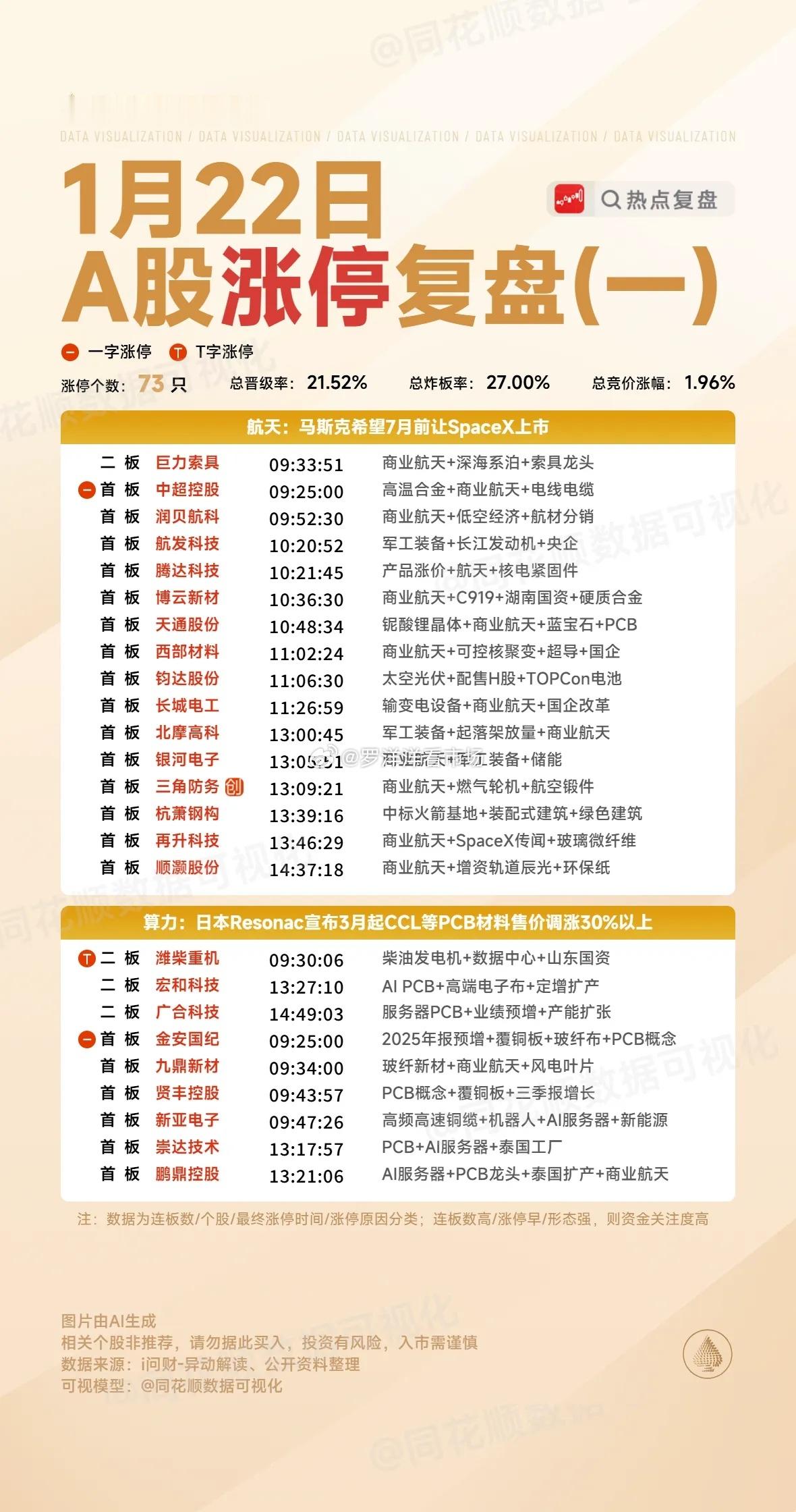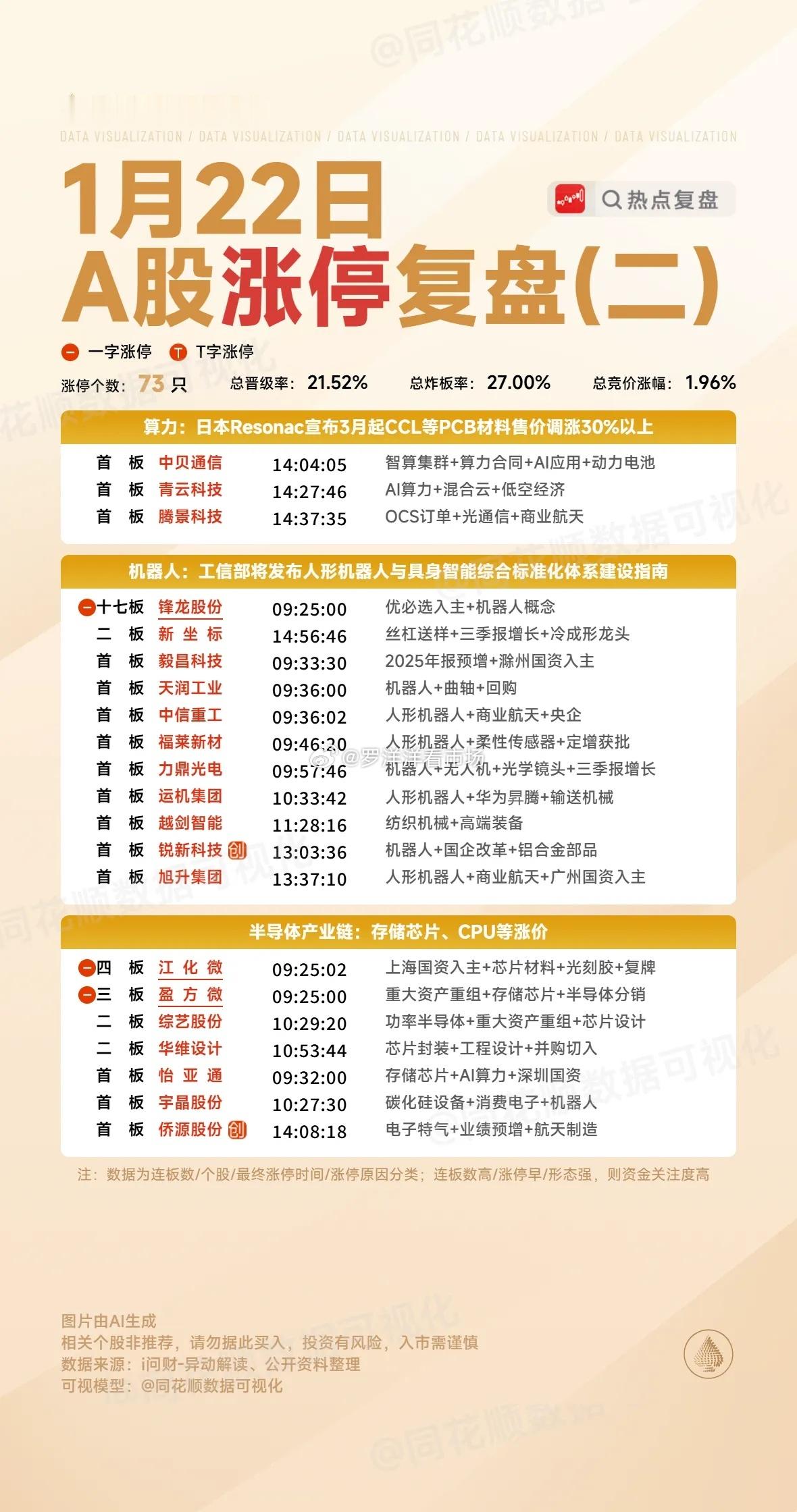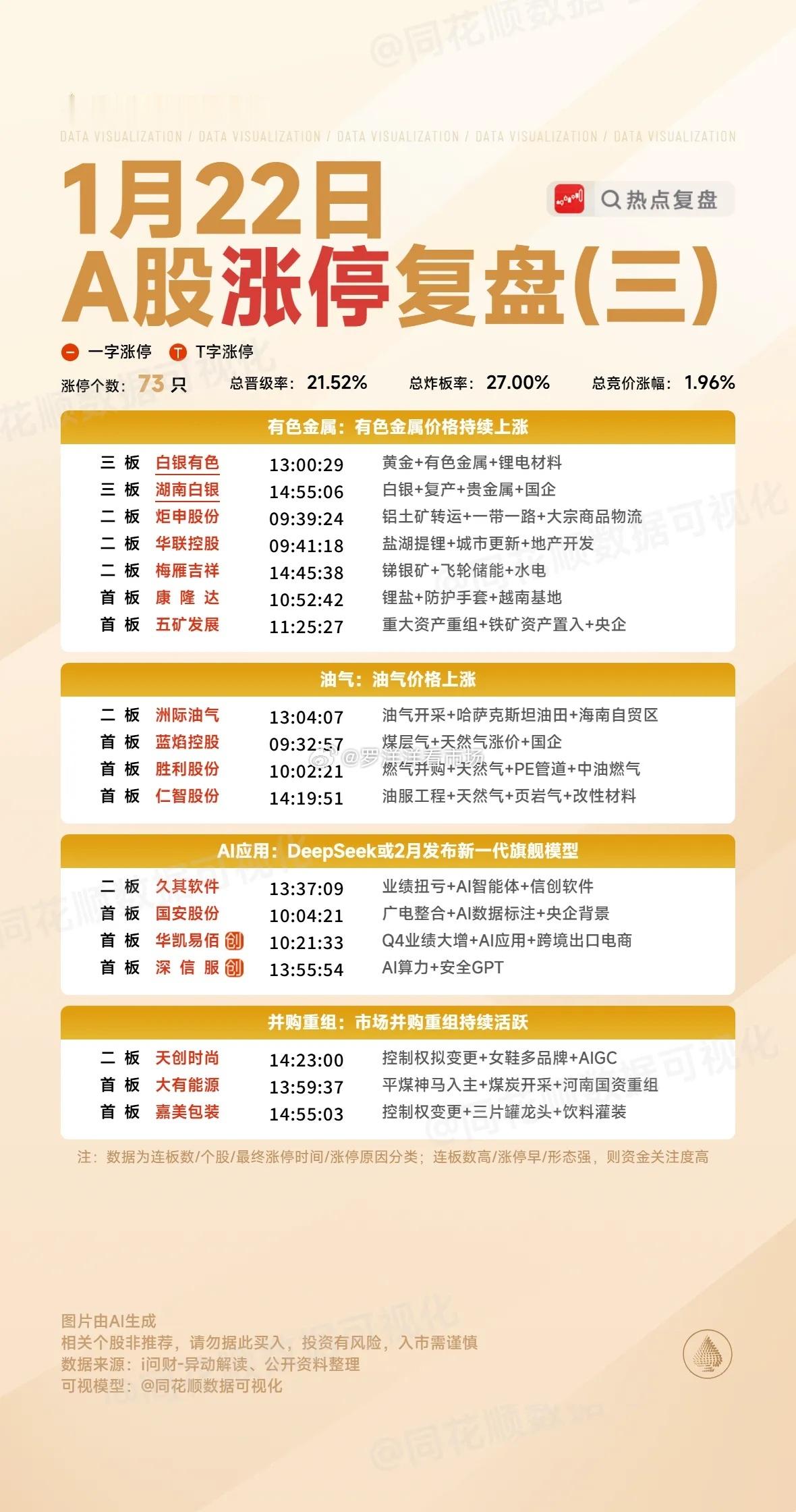 1月22日复盘:国晟科技、白银有色、中国长城、雪人集团、巨力索具隔日走势的一些看法!1、国晟科技(锂电池)国晟连续5个跌停后在今天午后终于迎来了翘板资金,打开跌停后仅用了3分钟就冲击到近涨停位置,在高位横盘释放了足够的抛盘后有资金尝试封板,但是第一封迅速打开,之后下杀过程中整体承接还是非常不错的,最终很快再次出现资金彻底封死涨停,走出了一个连续跌停后的地天板走势!盘后的龙虎榜方正两个杭州席位占据了买盘前两位,其中买二是曾经翘华夏的资金,买一大概率同样是关联资金,这两个席位几乎都是跌停板买入,当日大幅获利,买四这个席位同样也是翘板华夏的资金,同样成本价也是跌停位置附近,其余两个上榜席位成本价同样如此,卖盘上榜资金多为东财席位,单从榜单上看着很强,但是很明显今天的翘板资金就是明显的专业去抄底连续跌停的资金,情绪把握对了就很容易走出超强走势,国晟明显如此,但是这些资金隔日必然是无脑砸,毕竟国晟没有热点支撑,放出流动性后愿意持续接力的资金并不多,所以隔日国晟没有特别大的看点,如果竞价强,或许会给到溢价,但是一旦竞价偏弱,大幅获利资金肯定会无脑砸盘离场!2、白银有色(贵金属)白银期货夜盘是明显下杀表现,所以有色竞价出现明显低开表现,但是开盘后却出现了非常强势的拉升表现,因为白银期货早盘持续低迷,所以在高位并没有资金去承接封板,直到临近11点,白银期货迅速拉升红盘,在A股休盘时持续趋势走强,这也带动了有色午后开盘直接出现资金承接封板,走出了一个非常强势的3连板形态!盘后的龙虎榜买卖盘多为量化资金,是明显量化引导的榜单,而从有色近期的表现看,完全跟白银期货同步,在期货大涨时开始出现第一个涨停,之后的持续性更像是资金推着向上,而它本来应该要弱于盘子更小的湖南的,只不过那一只昨天尾盘有资金砸盘,反而让它成为了龙一,但是它的流通盘是偏大的,这样的持续性很难有持续性,而白银期货这几天整体滞涨也非常明显,所以对于有色来说,隔日大概率就是一个冲高断板的走势!3、中国长城(算力)长城竞价超预期开出一字板,但是整个科技是个明显高开兑现的走势,所以开盘后不久就出现明显资金砸盘兑现,虽然有短暂回封,但是砸盘力量非常大,好在下杀到5个点位置承接明显,之后全天在分时均线下方震荡,虽然有过拉升突破均线的表现,但是很快出现下杀,尾盘阶段出现资金强势做多,特别是竞价出现明显抢筹,最终抢筹到近涨停板收盘!长城最终正好控住了3个交易日偏离值20%的异动,再加上尾盘的抢筹形态,隔日走出冲高是大概率的,这只个股毕竟刚启动没多久,因为它流通盘偏大,在现阶段这个市场环境下更多的可能会是趋势上行,所以对于长城来说,隔日想要反包可能有难度,但是走出大幅冲高可能是大概率的!4、雪人集团(核电)今天商业航天相关方向修复明显,雪人也是一个高开后趋势上行的表现,午后有资金强势承接上板,并且很好的封死涨停!盘后的龙虎榜城管希买入1.5亿,吴航路这个雪人老庄席位买入8千万,其余上榜资金有外资、量化和机构,卖盘做T机构居多,这样的榜单是明显的情绪引导资金去做多封板,而且雪人这一波回调下来也比较充分,这个放量涨停形态还是非常漂亮的,再加上这只个股股性非常好,隔日出现资金承接做多概率非常大,一旦竞价有比较强的表现,雪人是隔日可以重点关注的1进2方向个股!5、巨力索具(商业航天)商业航天竞价阶段就出现了明显修复,巨力竞价最后阶段出现明显跳空抢筹,高开5个多点的情况下迅速出现资金承接封板,在板上小幅分歧放量后很快彻底封死涨停,走出了一个非常强势的二板形态!巨力作为商业航天唯一二板个股优势是非常明显的,毕竟今天整个板块高潮后,它就是妥妥的龙一了,隔日就算板块分歧,它也是最可能出现资金去主动承接的个股,而且它这一波回调下来量能释放的也非常充分,所以隔日巨力走出连板的概率是非常大的,而且它流通市值在现阶段是比较适合炒作的,它预期就是比今天更强的竞价高开秒板或者直接一字板,而一旦商业航天出现明显分歧,它或许会在盘中完成放量后再去彻底封死涨停,所以这只个股是隔日商业航天最值得关注的个股!本文只限于分享和交流,不构成投资建议,股市有风险,投资需谨慎!
