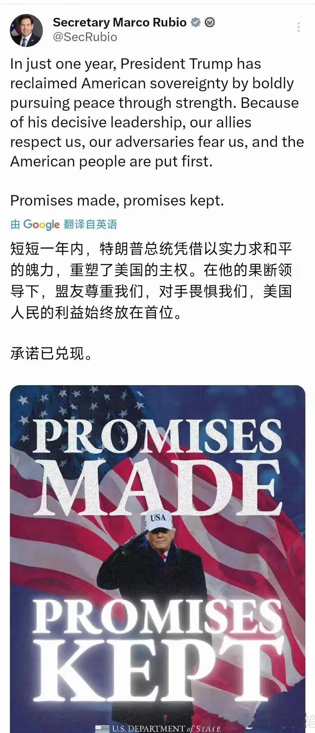 “在他的果断领导下,盟友尊重我们,对手畏惧我们,美国人民的利益始终放在首位”,这是特朗普开启第二任期一周年之际,美国国务卿卢比奥高度赞扬了自己Boss。 只不过,卢比奥的话是说反了吧,单就什么“盟友尊重我们”来看,特朗普威胁要强行接管格陵兰岛时,哪个盟友尊重与支持他的决定了?欧洲众多盟友除了反对之外,就是愤慨了。 跟着特朗普混了一年,卢比奥担任的职务是越来越多,国务卿、美国国家安全代理顾问、国际开发署代理署长、国家档案局代理局长等,这也反映了特朗普对他的器重。 按特朗普第二任期的用人标准,“忠诚”绝对是排在第一位,所以趁着特朗普周年纪念,身兼多职的卢比奥站出来表“忠心”是很自然的事。 卢比奥鬼精得很,知道Boss最喜欢别人拍他马屁。