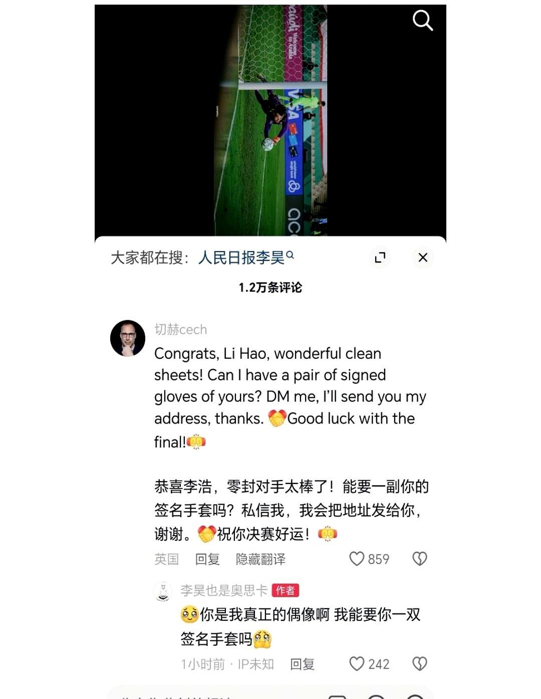 19岁国门火了,切赫追着要签名手套。 这事就发生在前几天,U23国足的小伙子们创造了历史。5场比赛一球未丢,硬是把自己从不被看好的第四档球队,一路抬进了亚洲杯决赛。门将李昊,就是那个19岁的年轻人,成了定海神针。 他不仅扑出了关键点球,还让自己的偶像、前切尔西门神切赫亲自下场评论,希望能得到他的一副签名手套。这种认可,比赢多少球都让人激动。 这批年轻人真的不一样了。他们不光防守做得好,整个队伍都透着一股韧劲。时隔22年,中国男足的队伍再次站上洲际大赛的决赛场,这个成绩本身就足够提气。 不光是切赫,连内马尔和欧文都来给小伙子们点赞。内马尔用中文拼音留言“真棒”,欧文鼓励他们继续去拿下冠军。这种来自世界级球星的关注,说明他们的表现确实征服了很多人。 过去我们总说技术不行,身体不行。但这支队伍告诉我们,先把防守做到极致,把团队执行力拉满,一样能打出好成绩。这对常年处于低谷的中国足球来说,不止是一场胜利,更是一种希望,一种思路。 接下来就是和日本队的决赛。不管结果如何,这群年轻人已经证明了自己。他们用最扎实的表现,给所有球迷打了一针强心剂。
