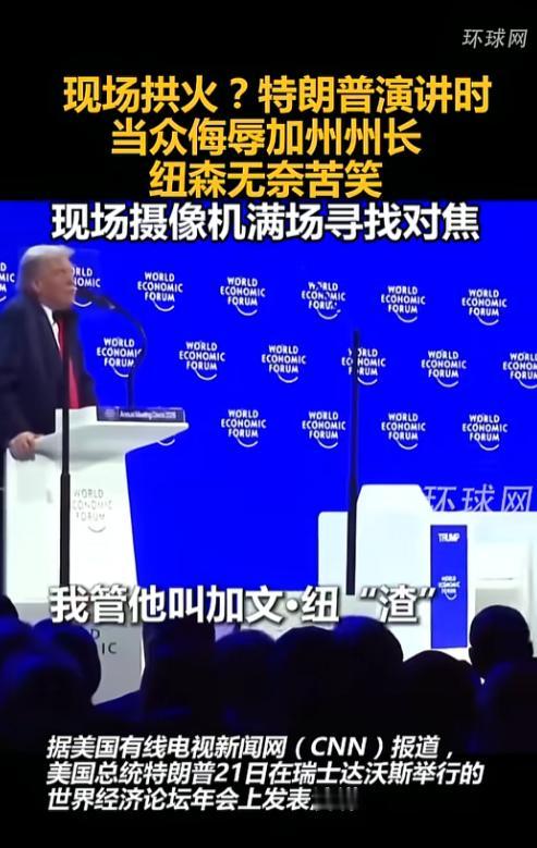 达沃斯秒变美国骂战现场,昨天的世界经济论坛本来是全球商界大佬谈合作、聊趋势的高端场子,结果被特朗普直接带偏成了美国内斗现场。   当时特朗普正在台上激情演讲,话锋突然一转,就对准了台下坐着的加州州长加文・纽森。   他先是把加州的政策批得一无是处,接着更绝,故意把纽森的名字念成“纽渣”,当着全球政商名流的面,直接给人扣上侮辱性外号。   当镜头立刻切到台下,纽森的反应直接把我看笑了,他嘴角扯了扯,挤出一个比哭还难看的苦笑,头也跟着无奈地摇了摇,那表情尴尬得都快溢出屏幕了。   其实这俩人早就不对付了,2025年加州山火时,特朗普就在网上追着骂纽森是“纽渣”,说他救灾不力。   可纽森也不是好惹的,直接回怼特朗普“散布谣言”,还吐槽他的移民政策是“搞独裁”。   这次达沃斯之前,纽森刚吐槽欧洲领导人对特朗普“太软”,特朗普团队就立刻施压,不让纽森在官方活动上发言,简直是针尖对麦芒。   这哪是什么政见不合,分明就是美国政客的流量大戏,本该聚焦全球经济的论坛,硬生生变成了美国两党撕逼的秀场。   而纽森那一笑,既是对特朗普人身攻击的无力反驳,也是对美国当下撕裂政治的无奈。   虽然咱们普通人看个热闹就行,但细想一下也挺讽刺的,美国国内一堆问题没解决,野火、移民、经济难题摆在眼前。   这俩大佬却忙着在国际舞台上掐架,用侮辱性外号博眼球,把好好的论坛变成了“骂街现场”。   不得不说,这波流量密码算是被特朗普玩明白了,就是苦了台下的纽森,好好参加个论坛,平白无故成了全球网友的表情包素材。