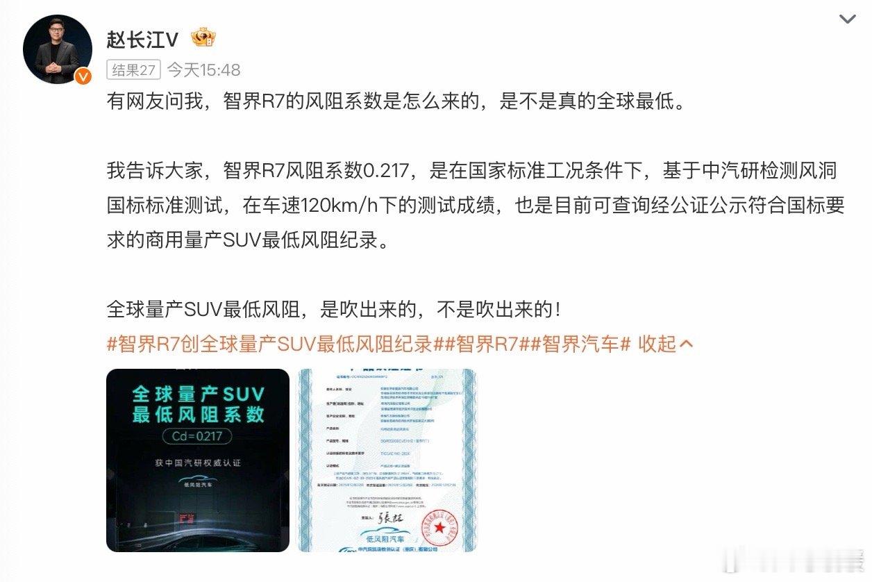 智界R7这0.217的风阻系数,咱实话实说,这成绩真挺牛的,但也无需过度神化,这不是说解决续航的万能药在高速上确实能扛不少风阻,续航优势才会显出来,如果在市区里走走停停的,风阻这点影响根本不够看的,续航好坏还得看三电、车重这些 赵长江回应智界r7全球最低风阻