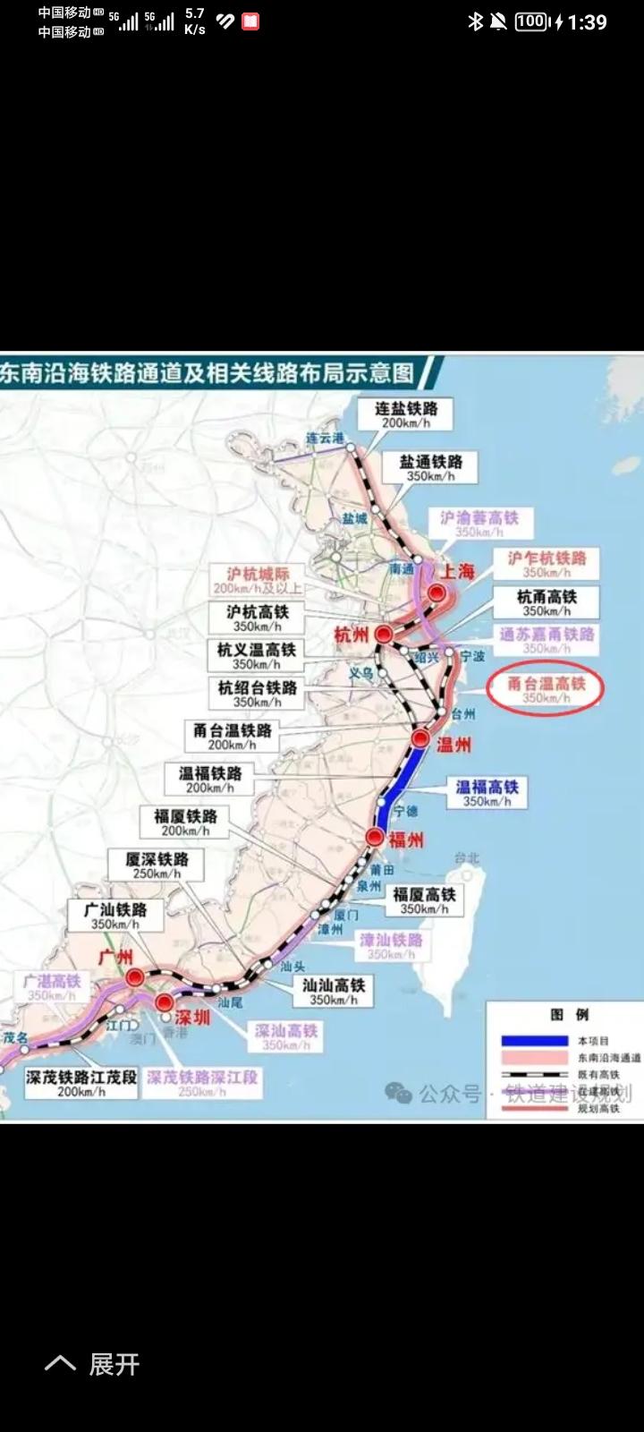 长三角沿海城市高铁以350公里至预留450公里速度上海至宁波慈溪走象山、台州走健跳、温州至福州台湾明年开建。
