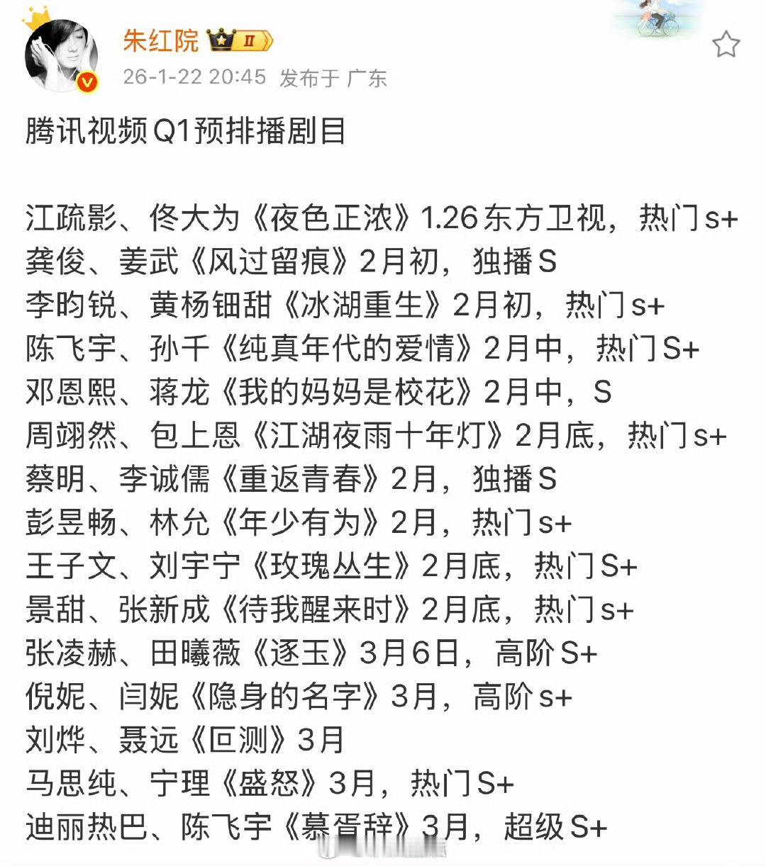 鹅的第一季度排播🐧这排得过来嘛,寒假档这么俏,不得抢档 我要被各种头衔的S项目搞晕了,只有迪丽热巴、陈飞宇的《慕胥辞》是超S+,大家看好腾讯视频Q1季度的哪部剧呀?