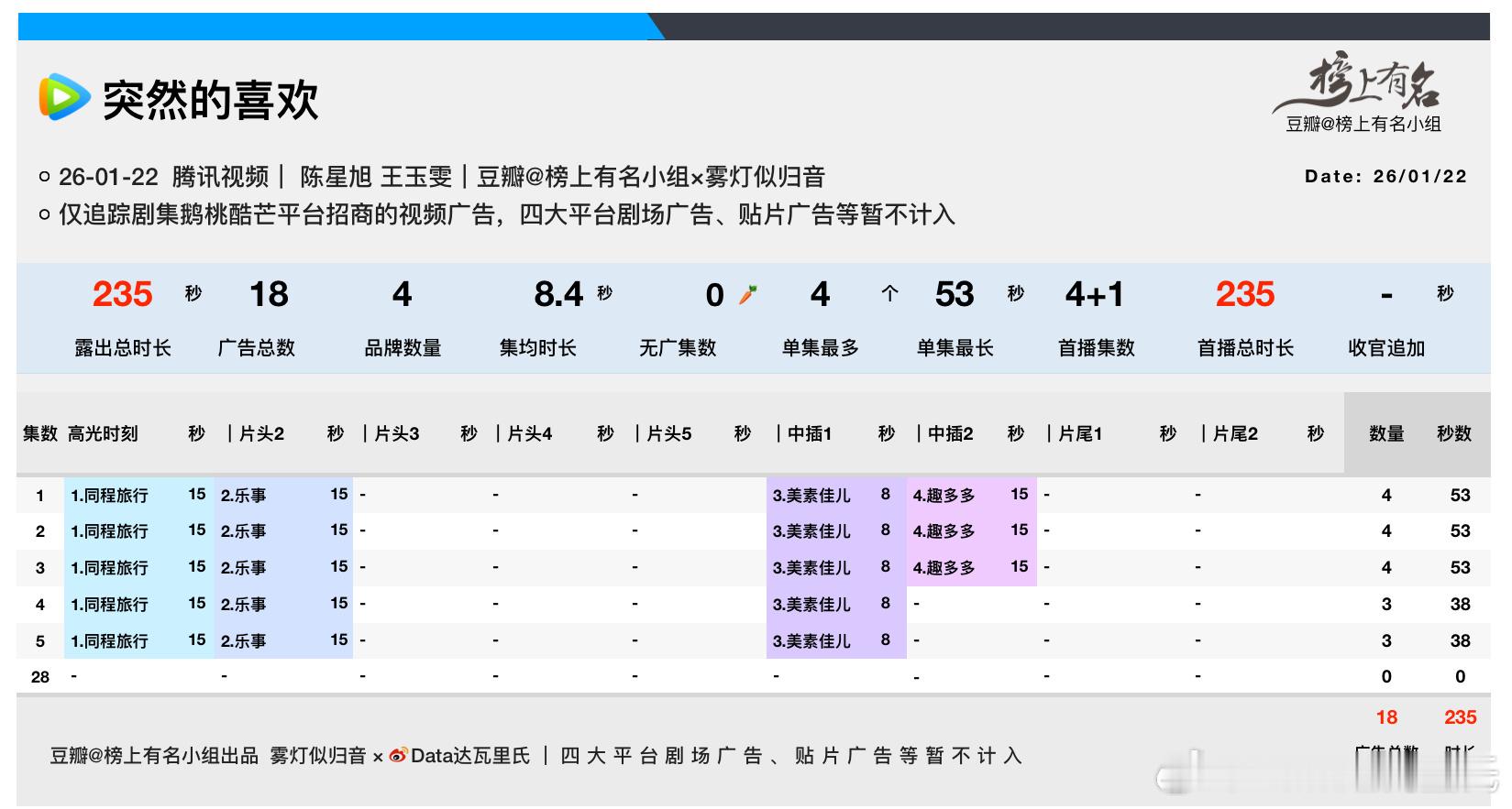 陈星旭、王玉雯突然的喜欢 开播,首播4+1集,4品牌,总时长235s首日腾讯热度21979,已经开始降了突然的喜欢腾讯热度值破22000要等明天了有没有看了的小同志,我刷到片断,王玉雯人设还蛮有趣的