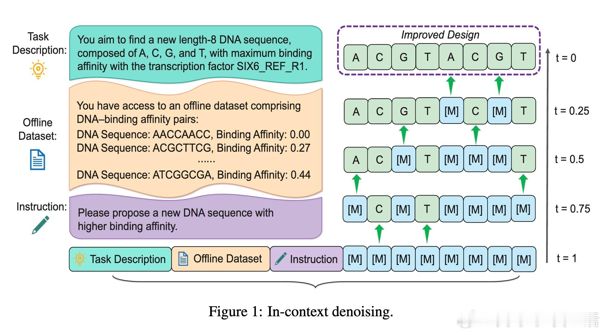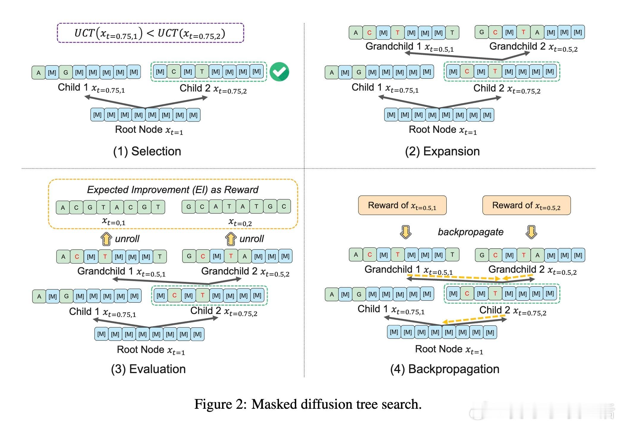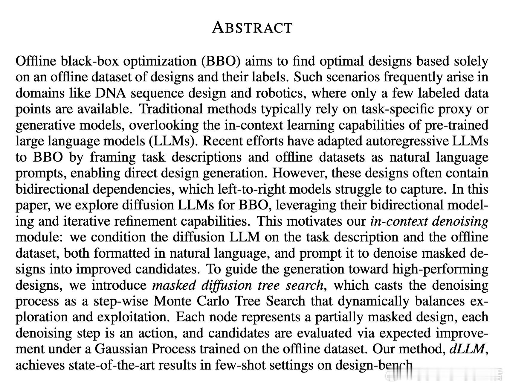 [LG]《Diffusion Large Language Models for Black-Box Optimization》Y Yuan, C (Sam)Chen, Z Sun, D Zhang... [McGill & MILA - Quebec AI Institute] (2026) 这篇研究揭示了扩散大语言模型(Diffusion LLMs)在黑盒优化(BBO)领域的巨大潜力。以下是核心研究成果的深度整理:在DNA序列设计、机器人形态优化等领域,我们往往面临离线黑盒优化的难题:只有少量已知的实验数据,且无法进行实时在线评估。传统的自回归模型(如GPT系列)在处理这类任务时存在天然短板,因为设计任务(如DNA序列)往往具有双向依赖性,即序列中间的某个单元不仅受前文影响,也受后文制约。针对这一痛点,本文提出了dLLM方法,将扩散大语言模型引入BBO领域。核心机制与深度洞察1. 从自回归到双向建模传统的左到右生成方式难以捕捉复杂设计空间中的全局依赖。扩散模型通过迭代去噪的过程,能够同时考虑序列的上下文信息。这种双向建模能力让模型在处理高维、复杂的优化任务时更加游刃有余。2. 提示词驱动的上下文去噪dLLM并不需要对模型进行昂贵的微调。它巧妙地利用了预训练模型的上下文学习能力,将任务描述、离线数据集和优化指令封装在自然语言提示词中。模型通过观察已有的设计案例及其评分,学习如何将一个全掩码或部分掩码的设计方案,逐步精炼为更高性能的候选方案。3. 掩码扩散树搜索(MDTS)这是本研究的神来之笔。单纯的去噪可能缺乏方向感,研究者引入了蒙特卡洛树搜索(MCTS)来引导生成过程。- 选择:利用UCT算法在探索新方案与利用已知好方案之间取得平衡。- 扩展:利用扩散模型生成多样化的子节点。- 评估:引入高斯过程(GP)作为代理模型,通过预期改进(EI)准则为每个候选方案打分。- 回传:将奖励信号反馈至搜索树,动态优化后续的搜索路径。实验结论与启发在Design-Bench基准测试中,dLLM在Ant/D’Kitty机器人形态优化以及TF8/TF10 DNA序列设计任务上均取得了SOTA性能。深度思考:- 规模化的新维度:除了增加模型参数,dLLM展示了通过增加推理时计算(增加树深度或分支因子)也能显著提升优化性能。- 语义引导的力量:实验证明,明确的任务描述能显著提升生成质量。这说明大模型不仅是在做数值拟合,更在利用其预训练阶段积累的跨领域常识来辅助设计。dLLM的成功标志着大语言模型正从单纯的文本生成器进化为通用的科学优化器。在数据稀缺的科研场景下,这种结合了扩散模型双向建模与树搜索启发式探索的方法,为药物发现和工程设计开辟了新路径。arxiv.org/abs/2601.14446