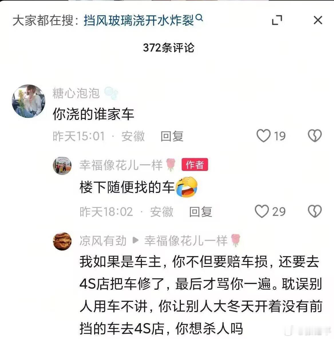女子用开水浇他人车玻璃测试会否炸裂这个行为抽象到让我觉得是演的。我一直觉得,生活中不缺少一些普通坏人,但坏的这么理直气壮的并不多。当然,如果只是个摆拍剧本,用的是自家车,同样不鼓励这种行为。一是娱乐骗网友玩很招骂,二是大冬天的好好的车你损坏它干什么。