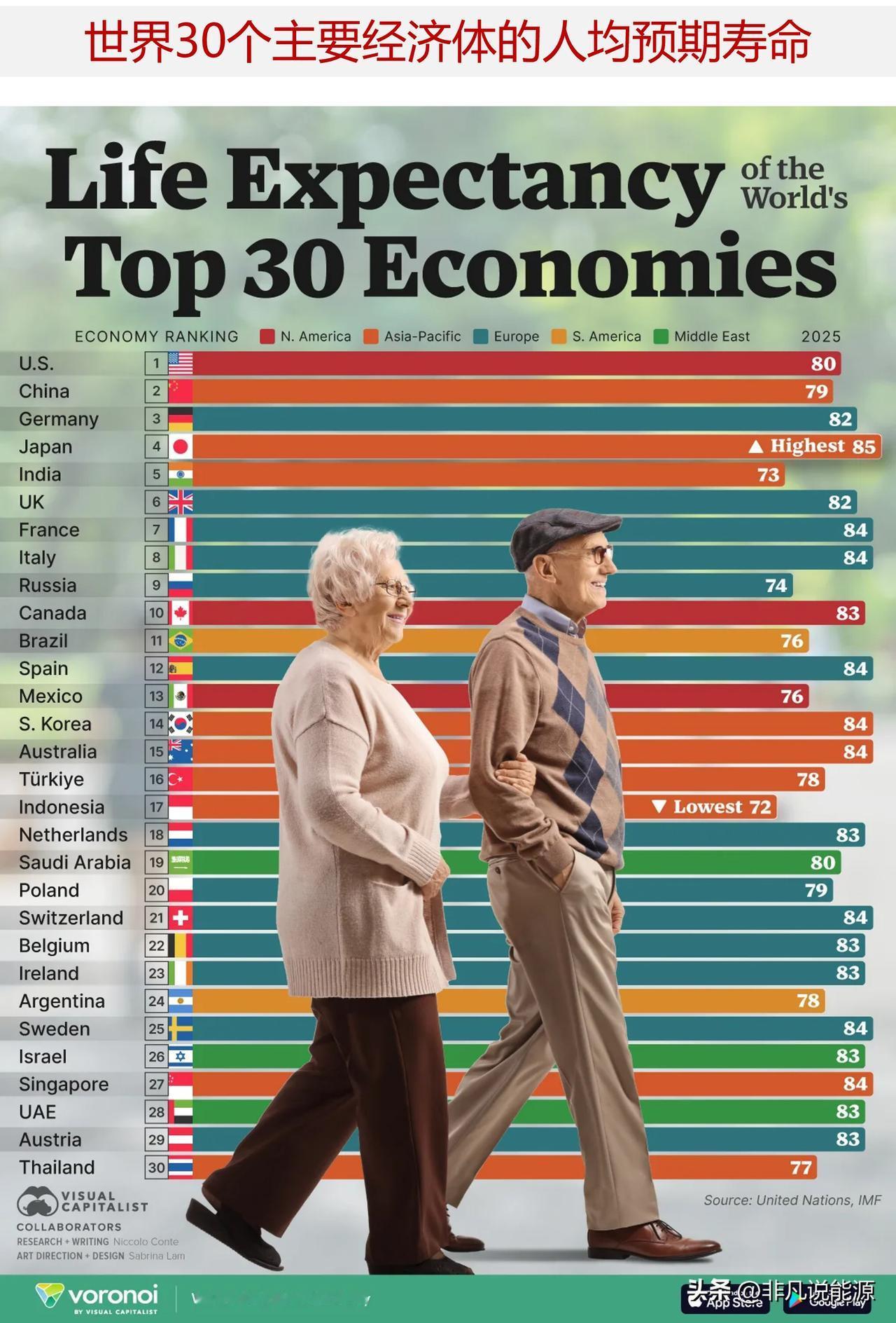 世界主要经济体的人均预期寿命对比 尽管身处全球最大的经济体之中,但美国人的预期寿命却低于许多其他富裕国家的居民。 日本是全球第四大经济体,其国民平均寿命比美国人长约 5年。相比之下,法国和意大利等国的居民寿命则比美国人长约 4 年。 这张图表展示了全球 30 个最大经济体中各国家的预期寿命情况,数据来源于联合国。国内生产总值数据则来自国际货币基金组织。 以下图表将各国按照 2025 年的国内生产总值进行排名,并同时列出其出生时的预期寿命。 美国人的平均预期寿命为 80 岁,这一数字低于许多其他主要经济体的国民预期寿命。这种差距是由多种因素造成的,包括医疗资源的匮乏、高肥胖率以及较高的凶杀率。 值得注意的是,美国是 G10 国家中唯一一个没有全民医疗保障的国家。此外,美国在富裕国家中医疗费用也处于最高水平,人均达 14885 美元,几乎是经合组织平均水平的两倍。 中国是全球第二大经济体,其人均预期寿命已从 1990 年的 68 岁提高到了现在的 79 岁。近年来,国家政策重点在于加强疾病预防工作以及扩大医疗保险覆盖范围。 印度的平均预期寿命为 73 岁,这一数字在按国内生产总值排名的前 30 个经济体中处于最低水平。而且,不同种姓人群的预期寿命差异显著,较低种姓群体的平均寿命比较高种姓群体寿命短约 4 年。 然而,在过去的六十年里,印度在全球范围内的人均预期寿命增长幅度位居前列。自 1965 年以来,平均寿命增加了 27 年。这主要得益于医疗保健领域的不断进步、儿童死亡率的降低以及营养状况的改善,而强劲的经济增长也起到了推动作用。