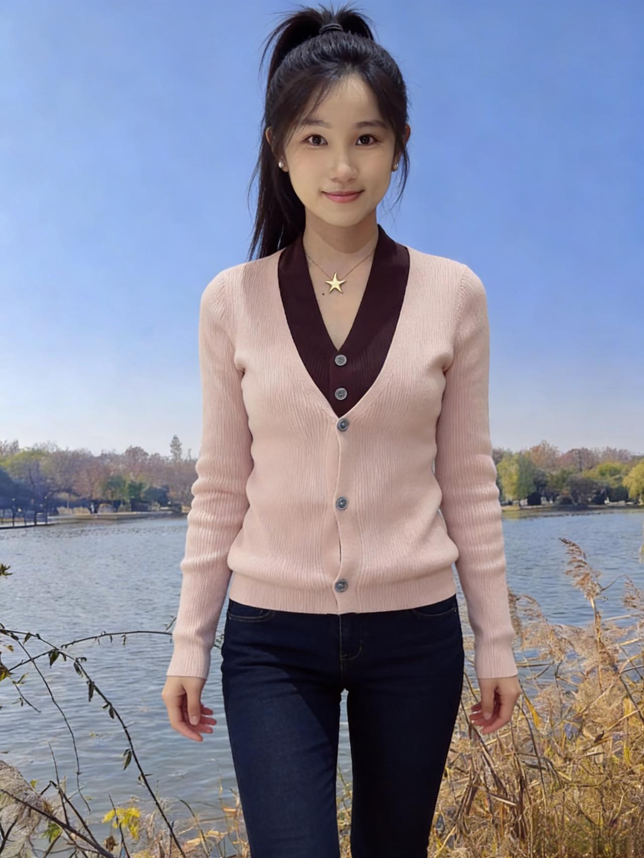 粉衫漫染半湖秋,马尾轻扬逐鹭鸥。 笑靥惊飞波上影,一川风色缘伊柔。