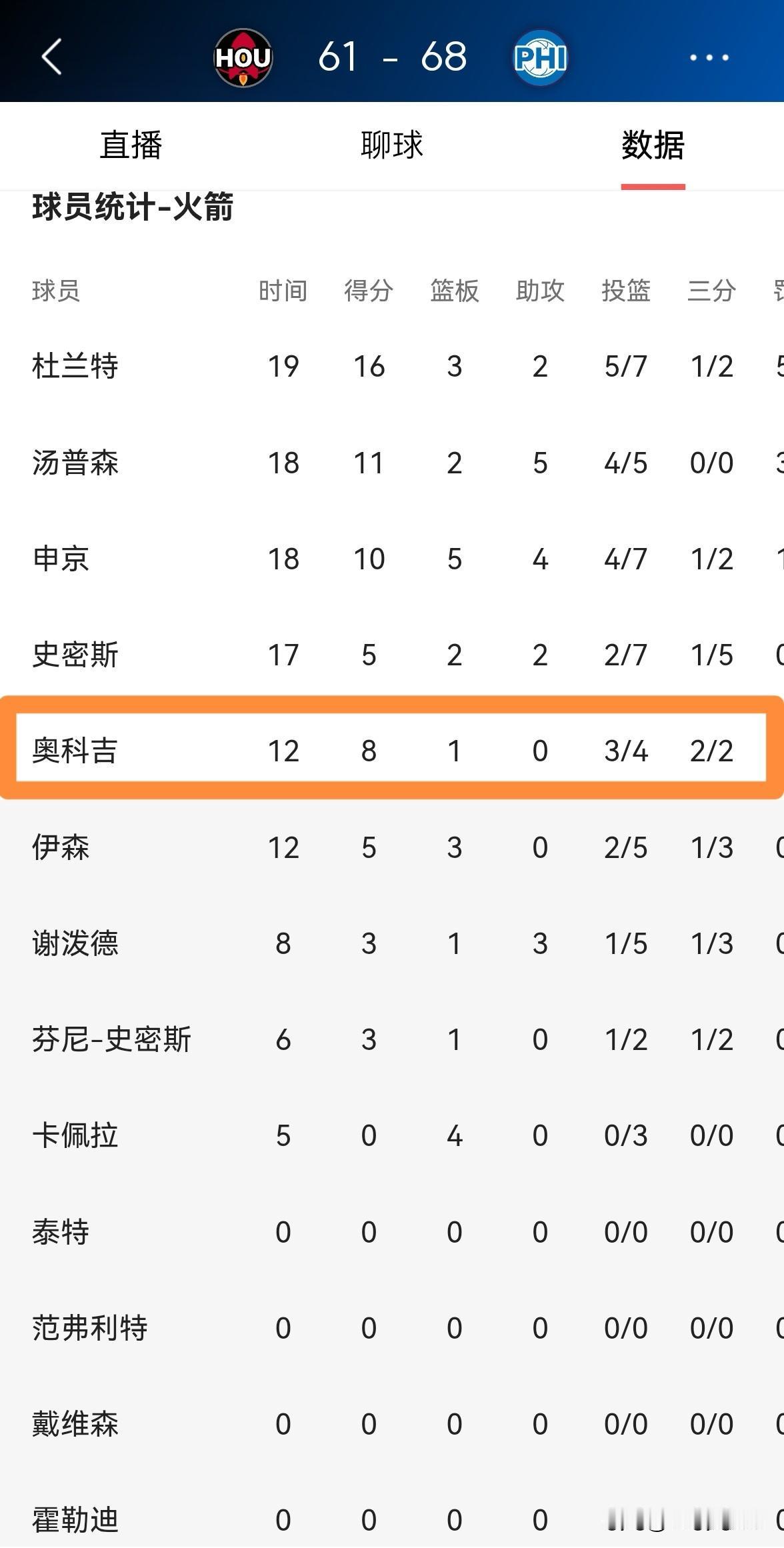 我一定要好好的夸夸火箭大将奥科吉!在今天进行的火箭和76人的比赛中,目前双方半场战罢,虽然火箭暂时以61:68落后于对手,但是奥科吉的表现却非常亮眼。 在前两节比赛中,奥科吉首发出战12分钟,投篮4中3,其中三分球2中2非常高效的得到8分,还有1篮板,他的场上正负值为全队最高的+6。 毫不夸张的说,当奥科吉能够频频的命中空位三分时,他在火箭的价值就会更大。