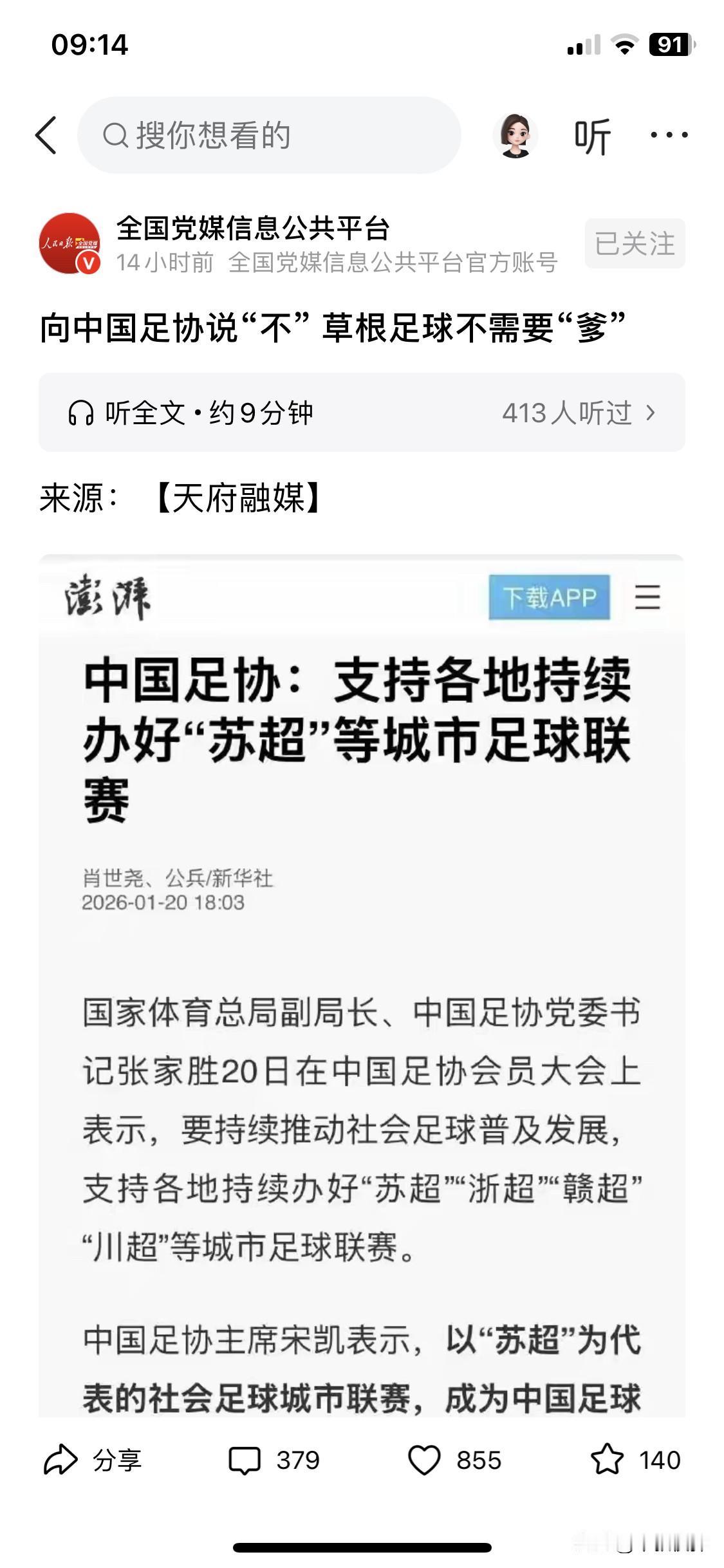 这篇文章不错,标题能这样写出来,还是全国党媒信息公共平台报道出来,非常好。中国足协想染指各省城市超级联赛实在是无语。自说自话什么跨区域比赛需要报备,搞得自己跟管理无人机那伙人一样。草根足球是人民对自己的谦虚称谓,书面语言是主人的足球!
