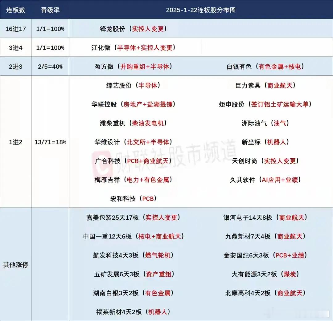 1月23日盘前预案:短线热点轮动,商业航天前排方向值得关注!1、市场整体趋势慢慢开始转好,三大指数集体止跌趋势明显,市场需要的慢牛节奏渐渐出现,量能也能够维持在2.5万亿以上,但是短线板块的轮动明显加速,这是典型的量化在引导短线情绪,比较好的一点是市场跌停个股持续减少,短线亏钱效应慢慢得到改善,盘后龙虎榜多数游资也开始持续流入,市场整体短线情绪是有一定改观的,但是高位接力风险仍然巨大,正常换手很难突破4板高度,所以在短线情绪上要注意好高低切换,毕竟高位接力的性价比越来越低!2、商业航天情绪低迷多日后终于迎来了全面修复,板块整体调整幅度非常大,多数强势股都超过30%的下跌幅度,昨天的全面反转或许会有一定持续性,但是从近期板块轮动的走势看,板块分歧在所难免,所以对于这个方向,前排个股的持续性非常值得关注,至于后排个股,在前排没有非常强的表现下,那就是去寻找冲高的卖点了!毫无疑问巨力的身位优势奠定了它在这波商业航天中的地位,从情绪上看,它就是一字板预期,如果它都开不出一字板,那么整个商业航天的表现可能就是大分歧了,所以它竞价的表现会是商业航天整体走势的一个风向标,原则上它是给不到买点的,但是如果商业航天整体分歧比较大,它或许有板上放量承接的机会,不过这个机会最好在早盘出现,午后的话就风险大于收益!中超的一字板是带动了商业航天反核的情绪,而且这只个股还是核电方向个股,它毫无疑问是这个方向首板的核心,从情绪上看,它就是继续一字板预期,但是近期短线情绪割裂,不排除它板上出现强承接换手的表现,总之,对于中超,不建议去排板,但是板上的分歧放量机会值得关注!航电毫无疑问是商业航天最早修复的个股,它昨天虽然没有去封板,但是趋势性的表现或许会有持续性,只要它趋势不变,整个商业航天持续性就值得关注,反之,一旦它开盘明显走弱,商业航天也就是大分歧的预期!雪人是核电方向个股,这个方向算是商业航天非常相关的分支,所以也是随着商业航天出现了大幅调整,在昨天商业航天大幅修复的情况下,雪人也是走出了趋势上板,这个底部止跌的涨停形态非常漂亮,有点类似AI的浙文,再加上这只个股的热度不小,短时间内或许会有资金持续炒作,所以对于雪人来说,一旦竞价有超强表现,晋级可能会是大概率的,这只个股毫无疑问是今天1进2方向可以重点关注的个股!3、白银期货夜盘继续大涨,这对于有色和湖南两只白银股肯定会有带动,早盘竞价高开是大概率的,但是从情绪上看,这两只个股在当前短线生态完全是异类表现了,流通盘偏大的情况下能够持续走出来与量化引导不无关系,而且从盘后的龙虎榜看,毫无疑问是量化和机构做起来的,对于这两个亲儿子,市场反而不会过强的约束,这也是它们能持续走出来的原因所在,但是不排除白银期货日盘会分歧走弱,所以接力这两只个股并不是一个好的短线思路,它们更多的可能是持仓者的盛宴!4、锋龙的一字连板仍在持续,虽然有预警停牌,但是对于它没有一点影响,反而小弟嘉美收敛了一点,但是看到大哥继续给力,一些踏空资金继续去捞嘉美,这就是重组股的优势,A股是个比较喜欢讲故事的市场,有重组的怎么涨都不过分,而因为题材短期出现大幅上涨就要被重点监管,双重标准真的无力吐槽,所以近期重组个股持续走强,天创也是卷土重来,再加上江化微和盈方微,整个重组行情热度持续不减,锋龙复牌后持续一字也没有停牌的意思,总得来说,这就是持仓者的盛宴,但是如果锋龙持续强势一字板,小弟的挖掘可能会越来越多,毕竟嘉美的幅度也非常大了,风险性相对会大很多!5、利欧昨天封单开始减少,但是仍然有86亿,这样的情绪下,按道理今天开板还是有困难的,但是从昨天市场短线跌停的情绪看,已经有明显好转,那么它今天出现开板放人也就存在合理性,毕竟它的两个地板也挺冤的,跟海格类似,同样没有挑战严重异动,但是一起当了一把冤大头,属于监管下的杀鸡儆猴标的,而它的连续跌停也使得整个AI应用方向畏畏缩缩,所以这个方向的修复还得利欧放出来再说,所以今天可能会是一个比较好的节点,会不会有资金跟随去翘板值得关注,毕竟从近期华夏、国晟的表现看,连续跌停板是有资金去博弈的,而且这两波资金有共通之处,所以利欧今天是走成金风的翘板形态还是走成海格竞价就开板,这会是不同的尝试,如果是跌停板有海量资金去翘板,至少短期内流动性值得关注,反之,如果像海格一样竞价去主动撤单开板,反而很难吸引资金的持续做多进攻,所以对于利欧来说,资金如何抉择是非常大的看点,开板不是今天就是下周一,而今天的话,盘中出现海量翘板资金的概率会大很多,从现阶段的情绪上看,是比较值得博弈的一个低吸点!本文只限于分享和交流,不构成投资建议,股市有风险,投资需谨慎!